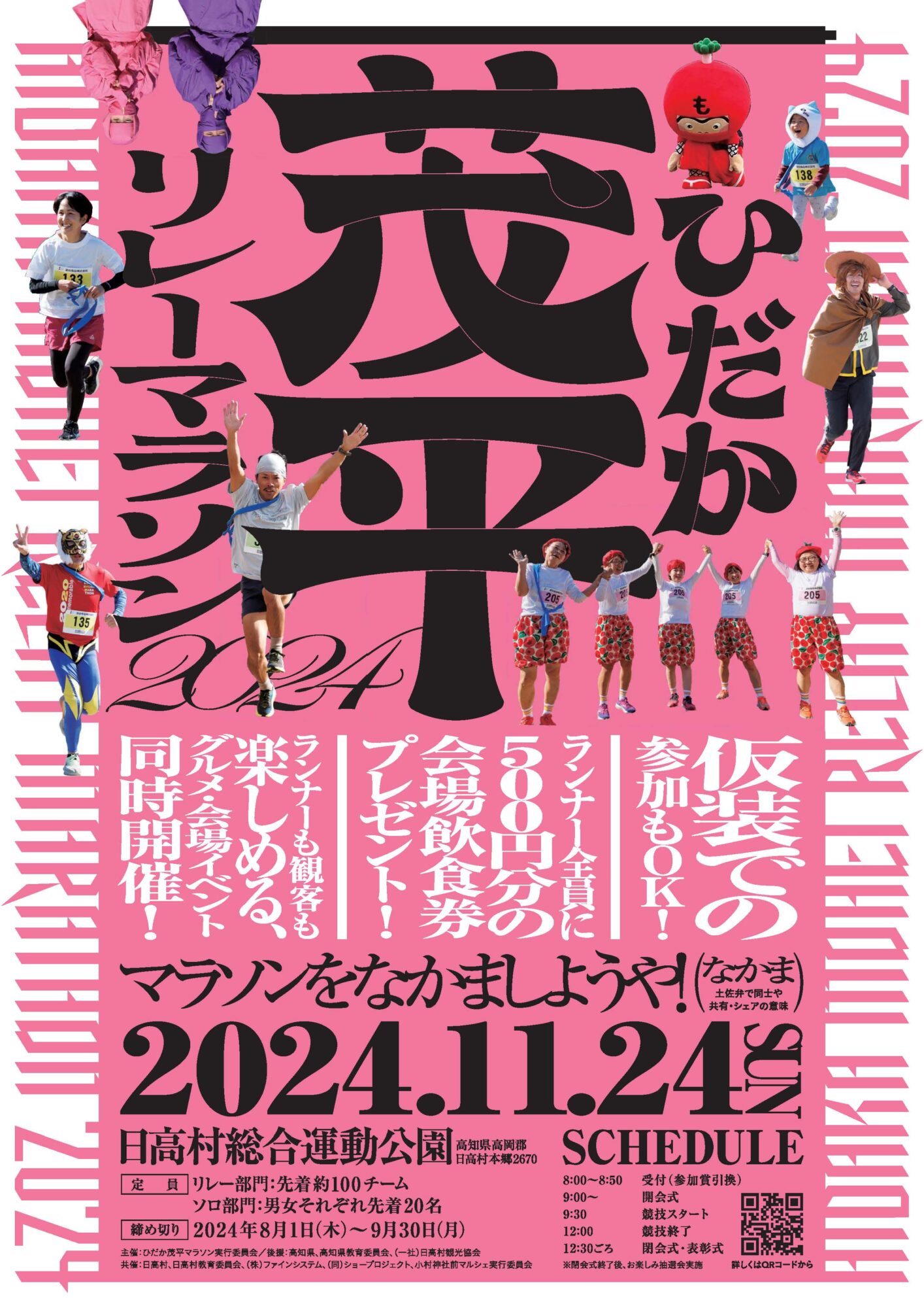 從日高村綜合運動公園繞日下川調整池一周約1.6km的特設路線,由隊伍一邊連結塔斯基(含量測晶片),一邊比賽在限制時間內跑了多少距離。此外,除了跑步者以外也能享受的會場活動非常多。小村神社前馬歇爾的飲食展位也預定開店。請和朋友、家人、職場的朋友約好後再參加。扮裝參加也OK!奔跑,玩,盡情享受日高村吧!