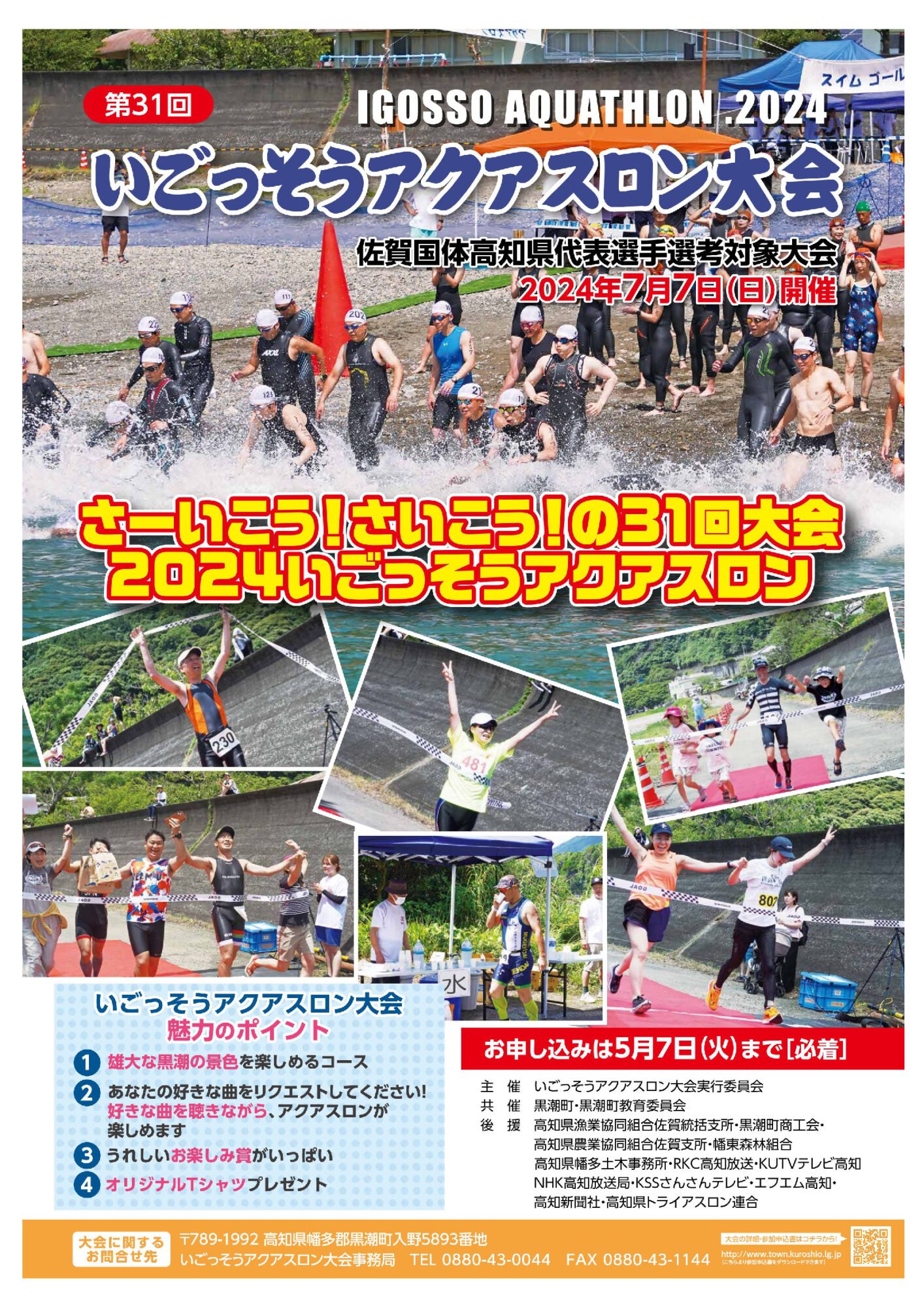 高知縣的發祥地是黑潮町·佐賀,在游泳和跑步的短距離比賽中也設有面向初學者的部門。大會前一天還會舉辦“親密接觸鰹魚派對”。釣一條鰹魚的漁夫町黑潮町佐賀的塔奇使用了當天釣到的新鮮鰹魚。在AQUAS朗的興奮的同時,可以享受到日本第一的鰹魚的味道。
