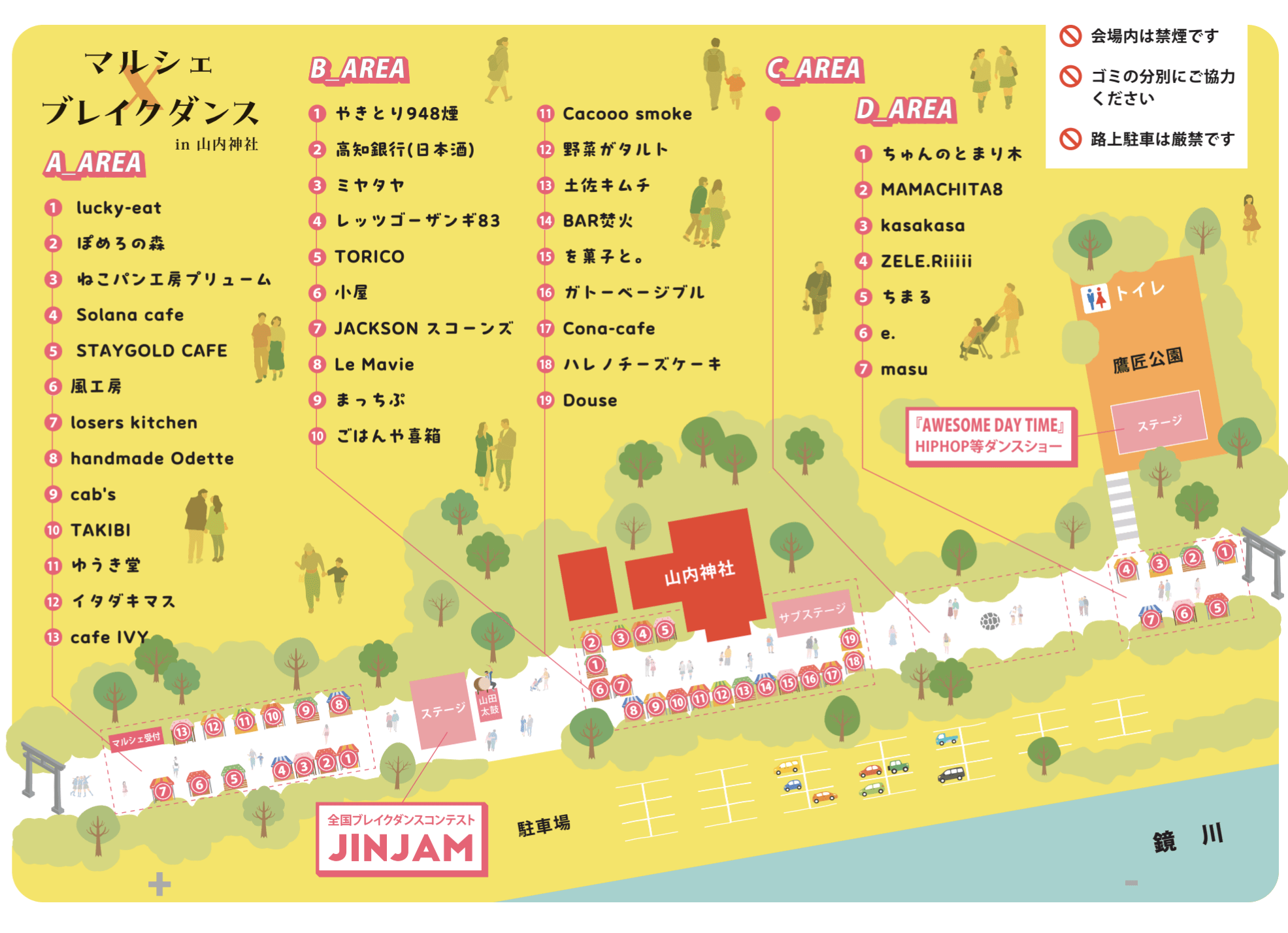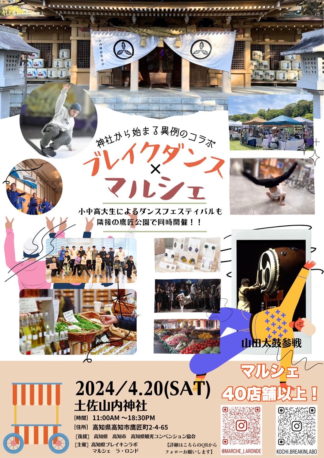 霹靂舞大賽和馬歇爾同時舉行!來自全國各地的爆紅舞者將會場捲入狂熱的漩渦中。在Marche可以享受40家以上店鋪的美食、飲料和雜貨。和山田太鼓的合作也值得一看。鷹匠公園還會舉辦孩子們的舞蹈節。