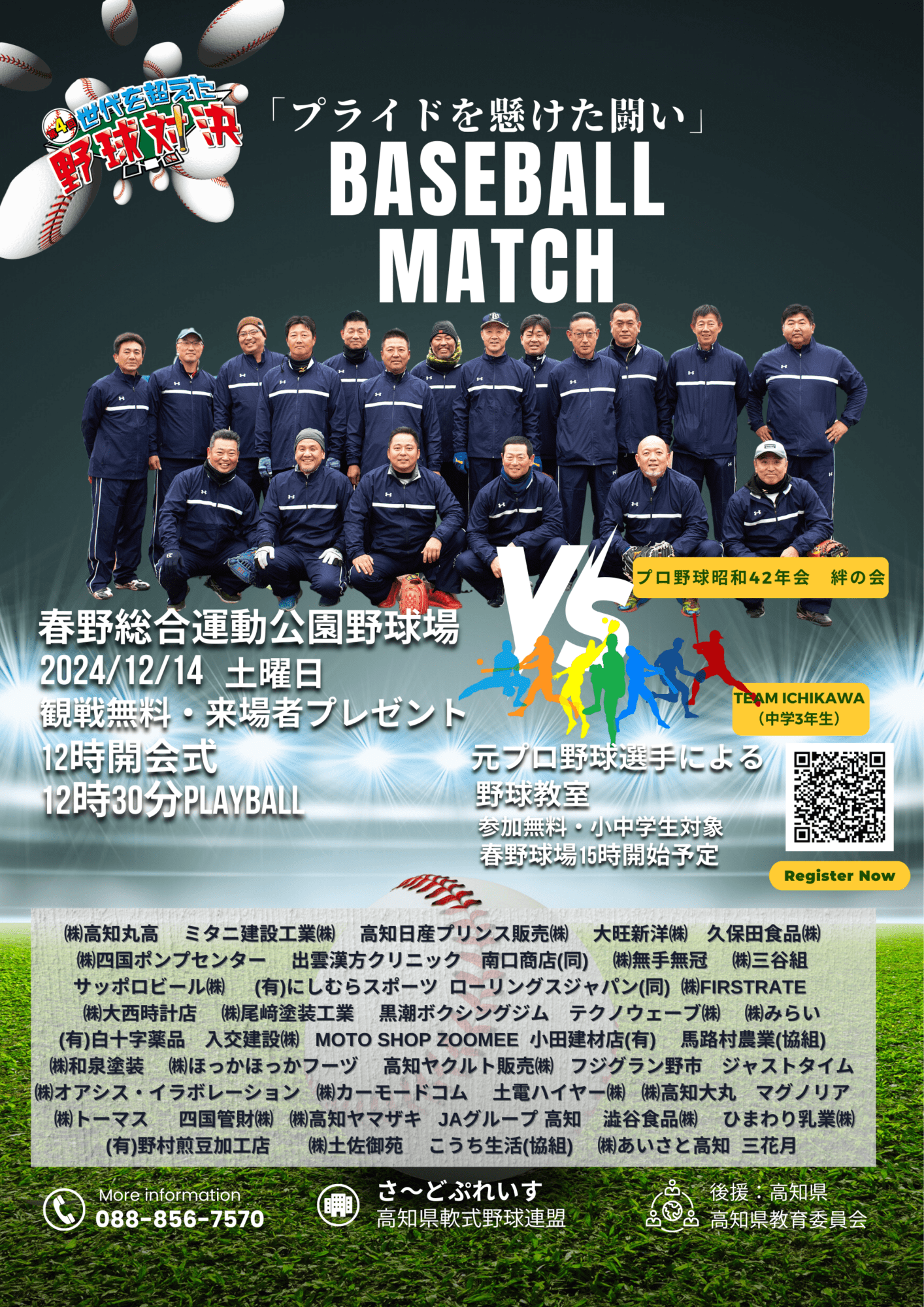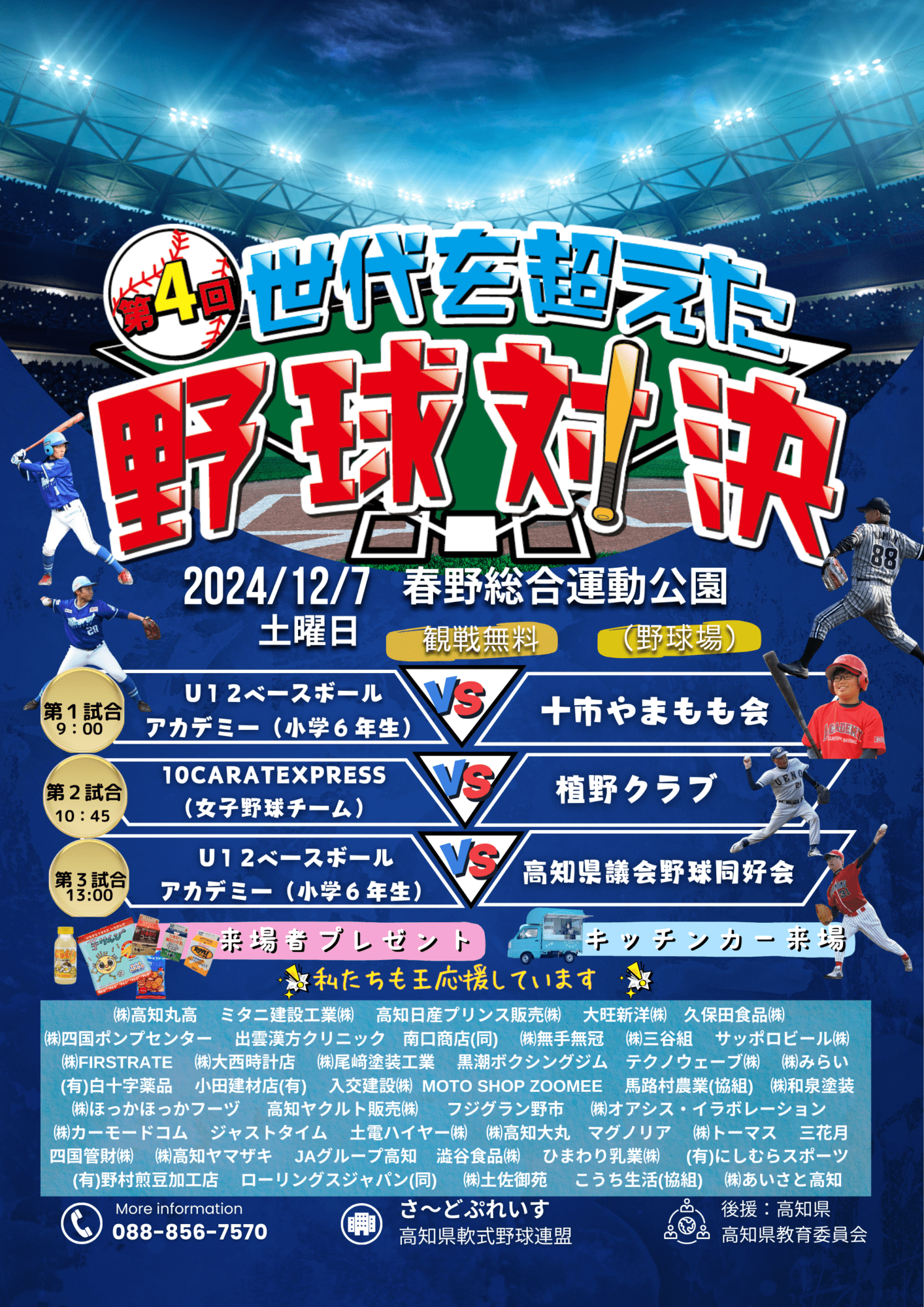 舉行超越世代的棒球對決。12月14日,包括往年的明星、活躍在巨人隊的桑田真澄在內的隊伍和高知縣的國中3年級隊伍將進行認真比賽。會場上也有來場的禮物和廚房的分店,請一定要來。