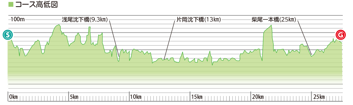 從越知町的中心部開始,沿著河繞仁淀川的中流區域一周的路線。整個路線都能在附近感受水質日本第一的仁淀川的同時心情舒暢地奔跑。途中經過中仁澱橋和淺尾沉降橋,可以眺望片岡沉降橋。