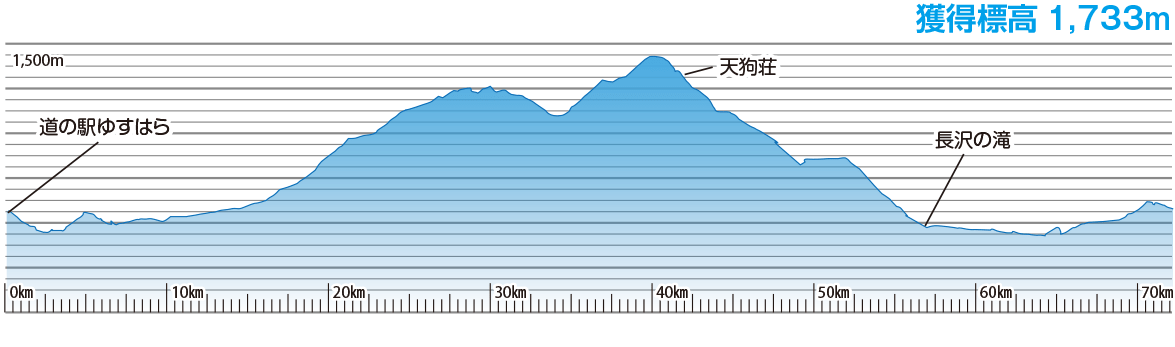 一邊蜿蜒一邊上下起伏,需要耐力的路線。位於日本三大岩溶之一的四國岩溶的天狗高原,從石錘連峰到太平洋都可以一邊欣賞雄偉的景色一邊行駛。