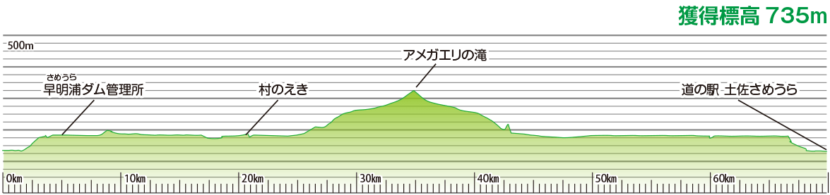 從道之驛梅裡,沿著早明浦水庫北岸行駛,向著阿梅加艾利瀑布上行,下行後沿著水庫湖的南岸行駛一周的路線。在被綠色包圍的自然資源豐富的區域,可以欣賞到湖畔廣闊的水邊景色和溪谷美。