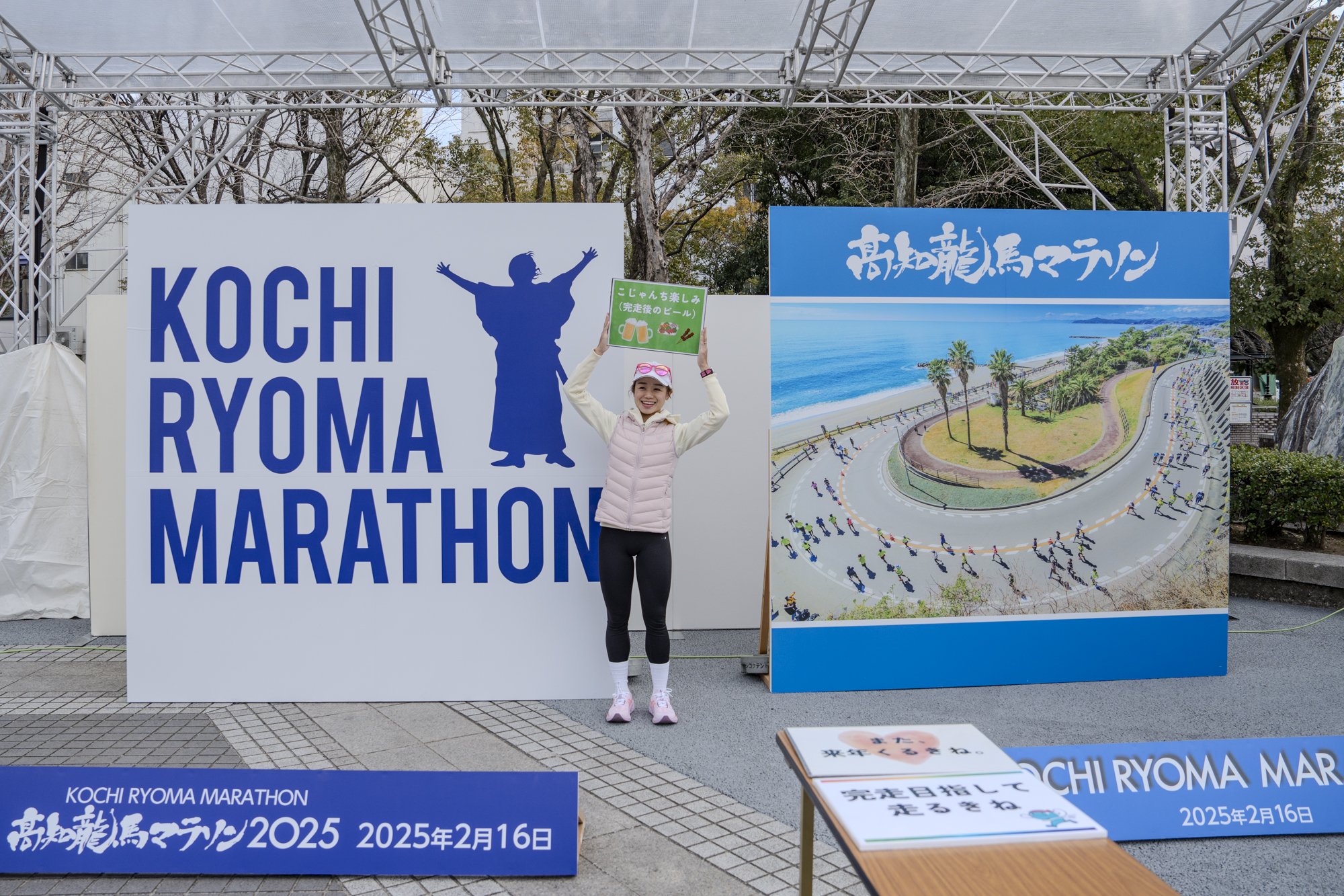 繼2024年之後,莉安第二次參加高知龍馬馬拉松。大會前一天的2月15日(星期六),和作為教練的丈夫零一起,去了高知市中心的東洋電氣化中央公園。這裡有面向外國人跑壘員的桌子,可以辦理受理手續。