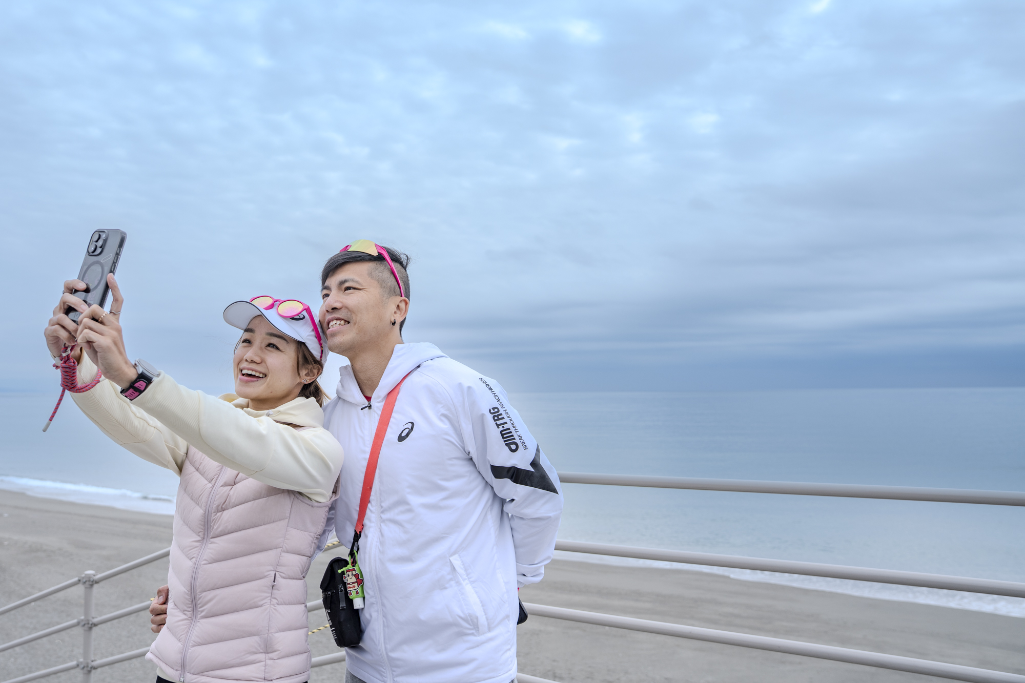 大會前一天,兩人一起去了最喜歡的海邊。拍了紀念照片。