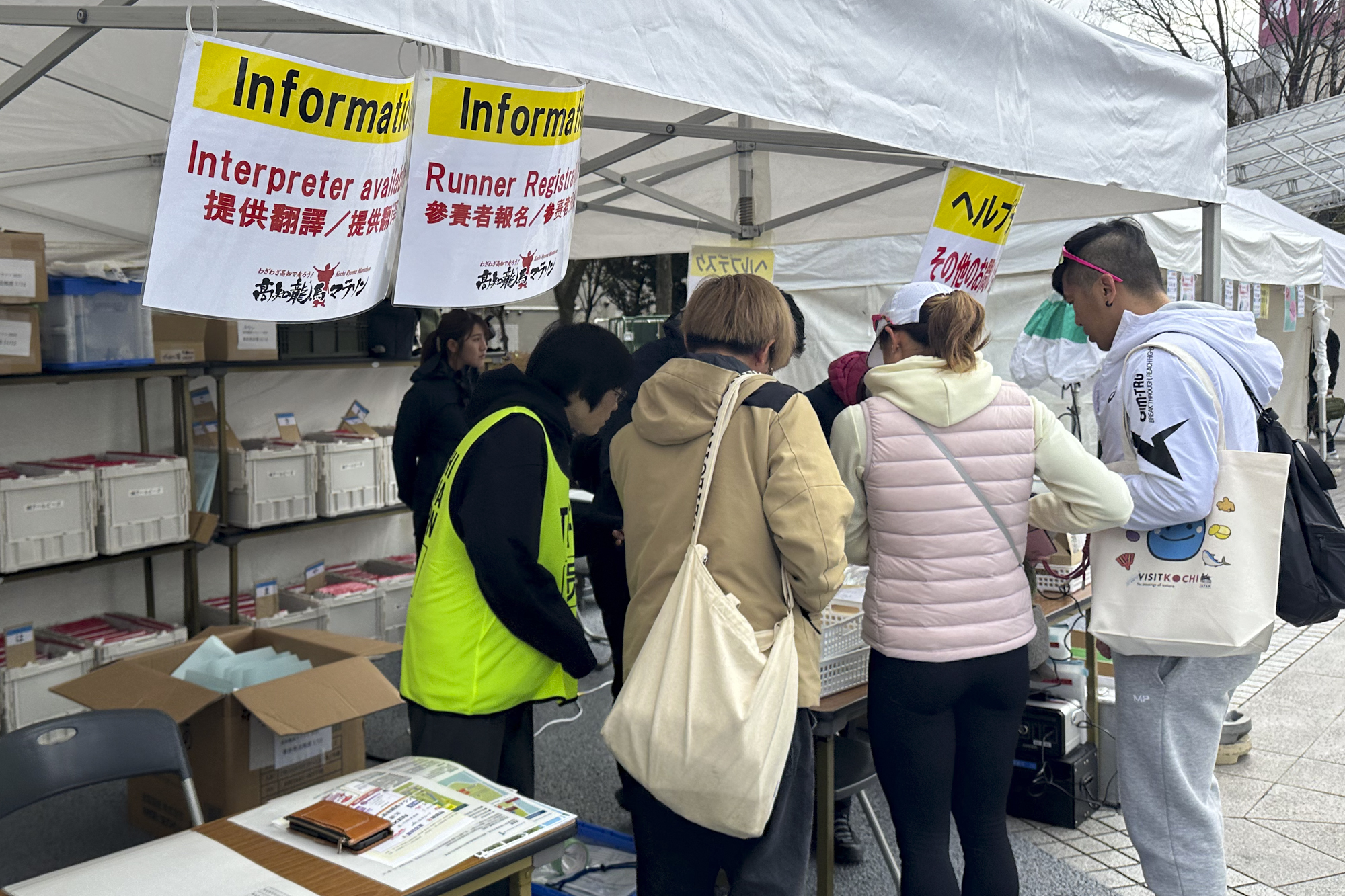 面向外國人的辦公桌。支持英語和華語,放心。從海外報名的人在這裡完成接待,領取運動員比布斯、跑壘員晶片、參加獎T恤等(從日本國內參加的人會事先發送)。