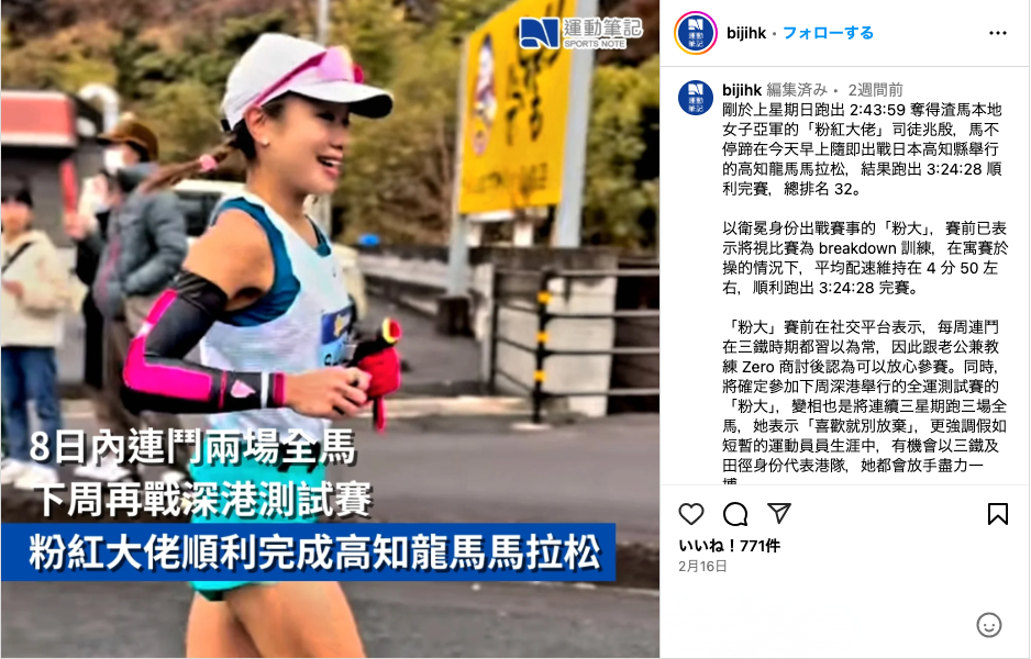 莉安說:“日本馬拉松很盛行。在香港,日本的馬拉松文化也很有名。能和日本的選手們一起跑步,我感到很高興”。