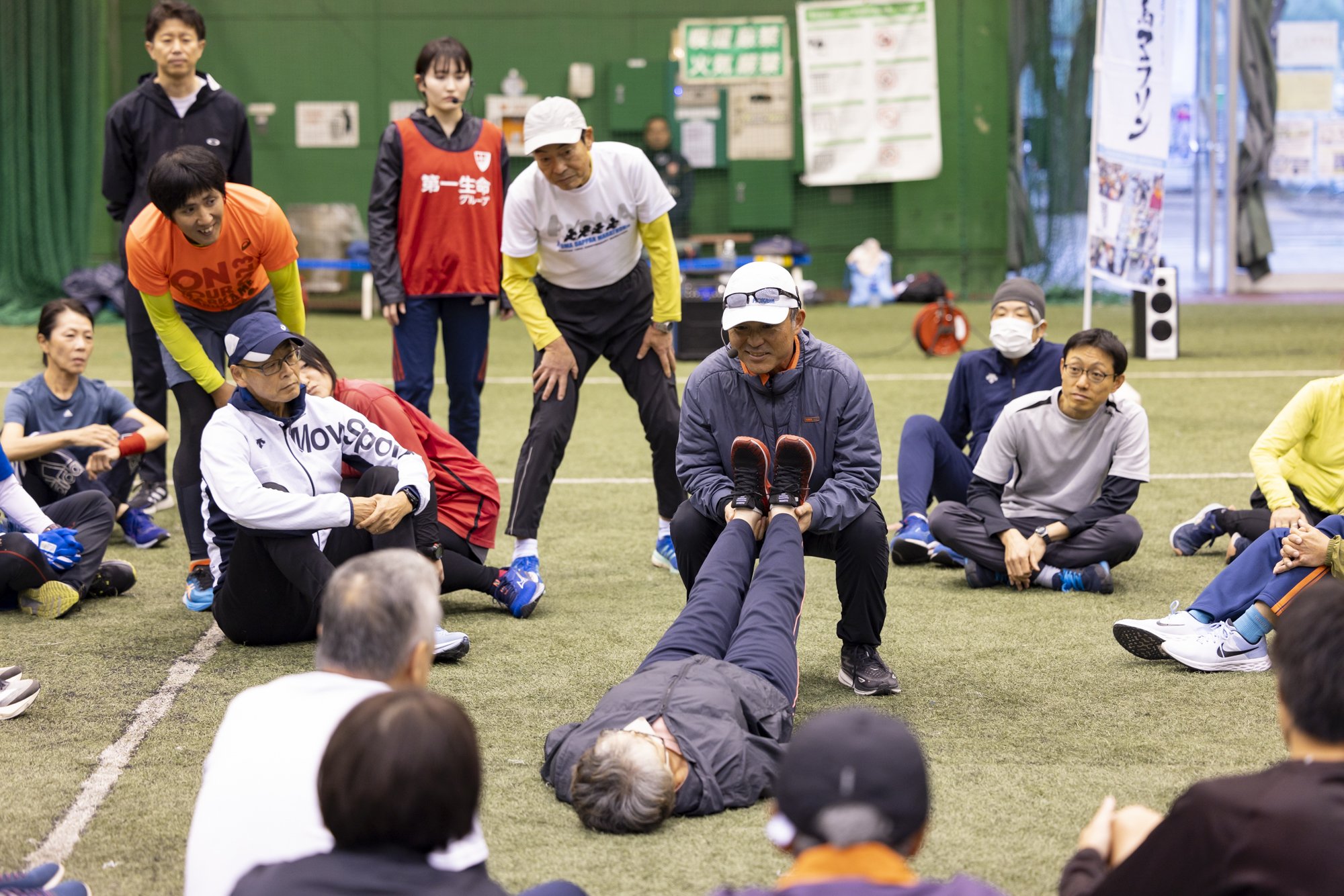 解說之後,是跑步前想做的基本伸展運動的演講。參加者們學習了膝蓋、股關節、阿基裡斯腱、肩胛骨周圍和關節周圍一個伸展的方法。