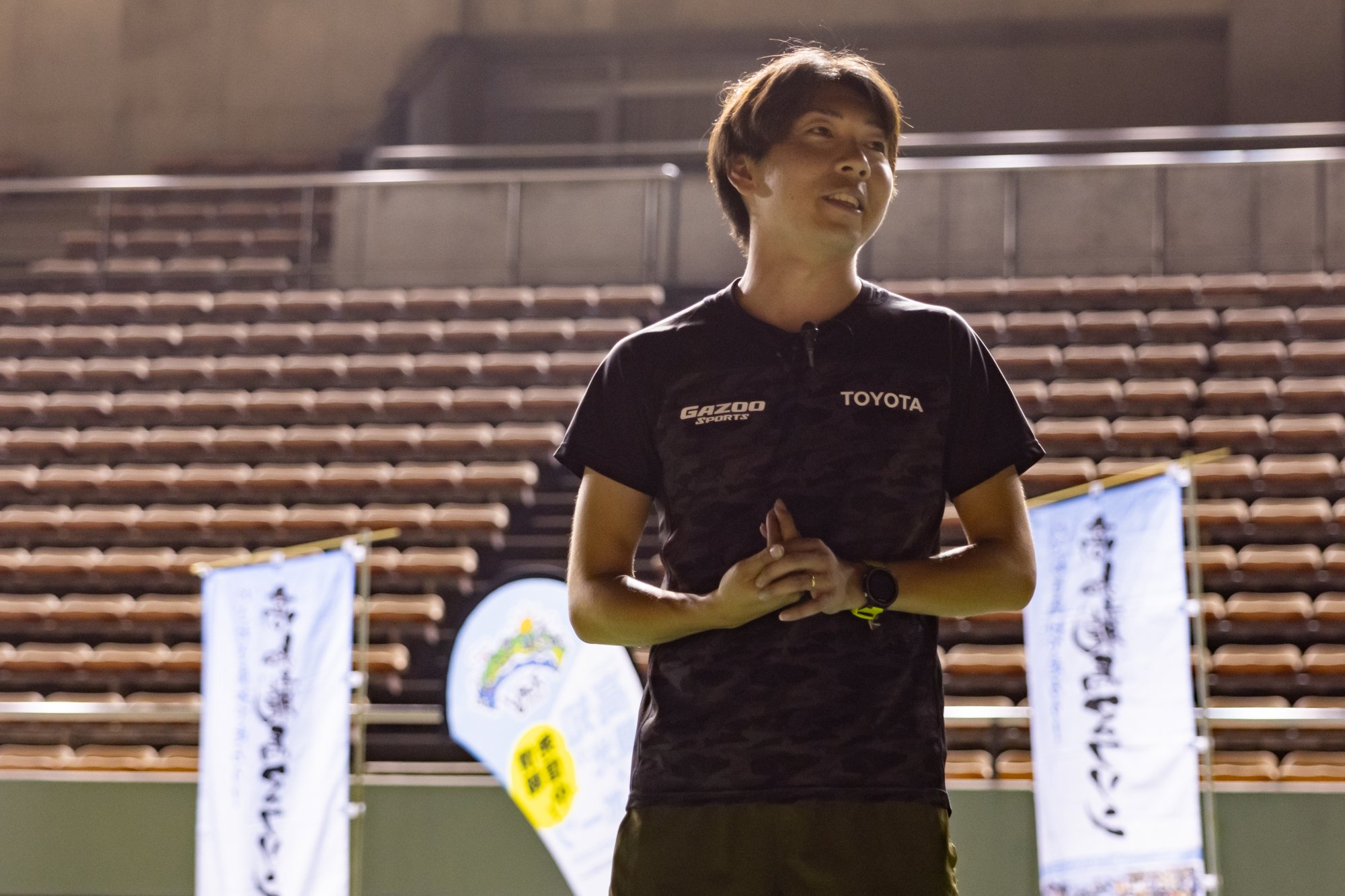 伸展運動之後是實際技巧。當天的講師是高知縣出身的原豐田汽車長距離部所屬的松本稜。去年也參加了MGC的頂尖跑壘員,在龍馬馬拉松2025中作為邀請選手預定參加全程馬拉松。