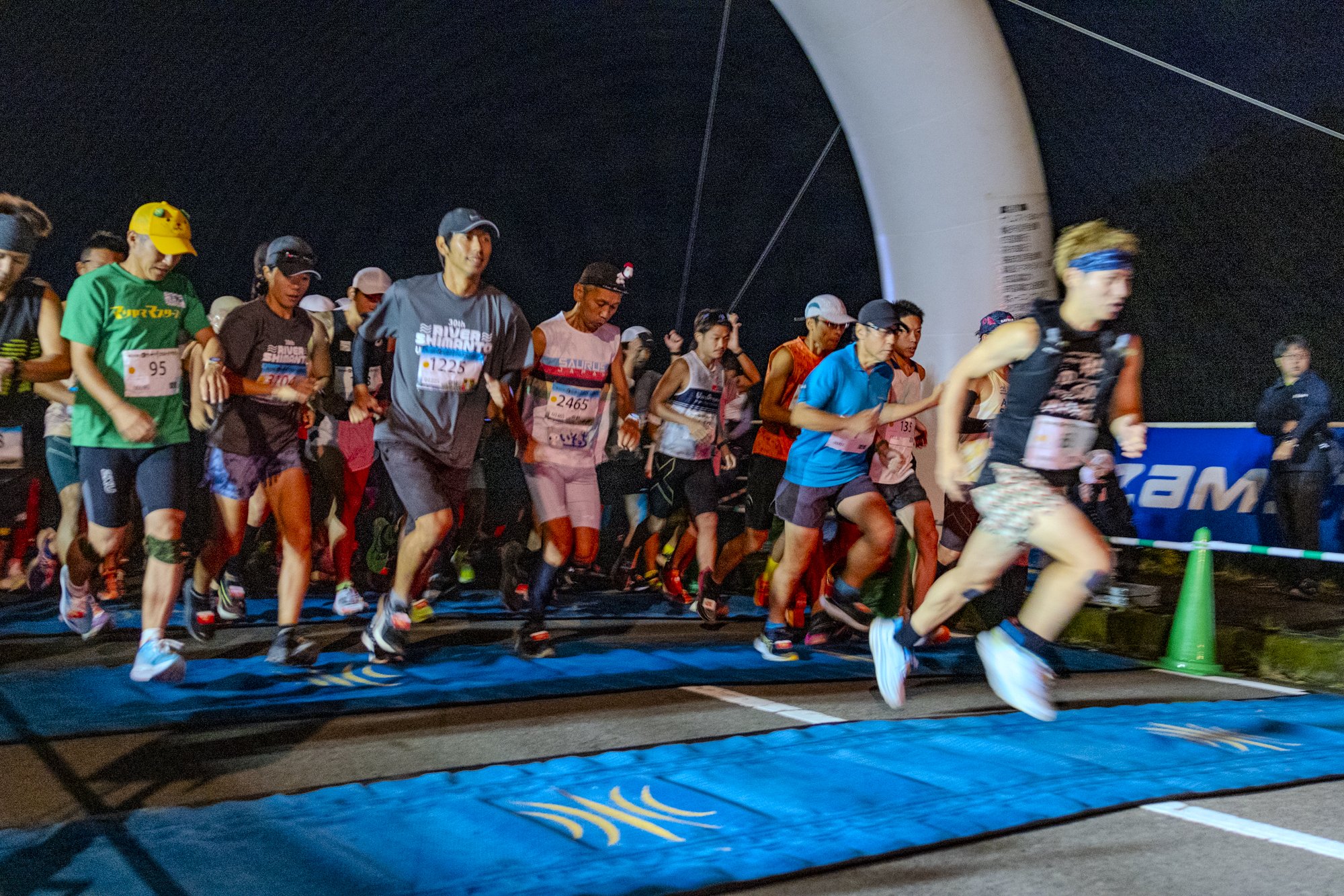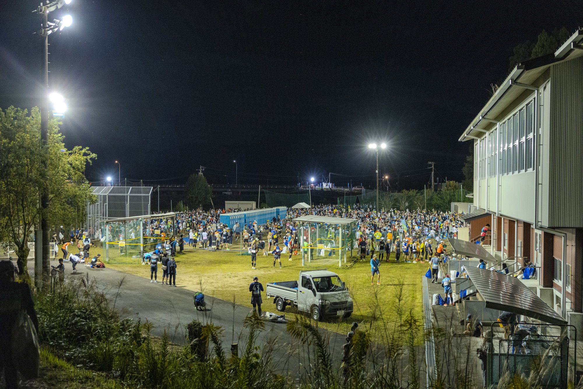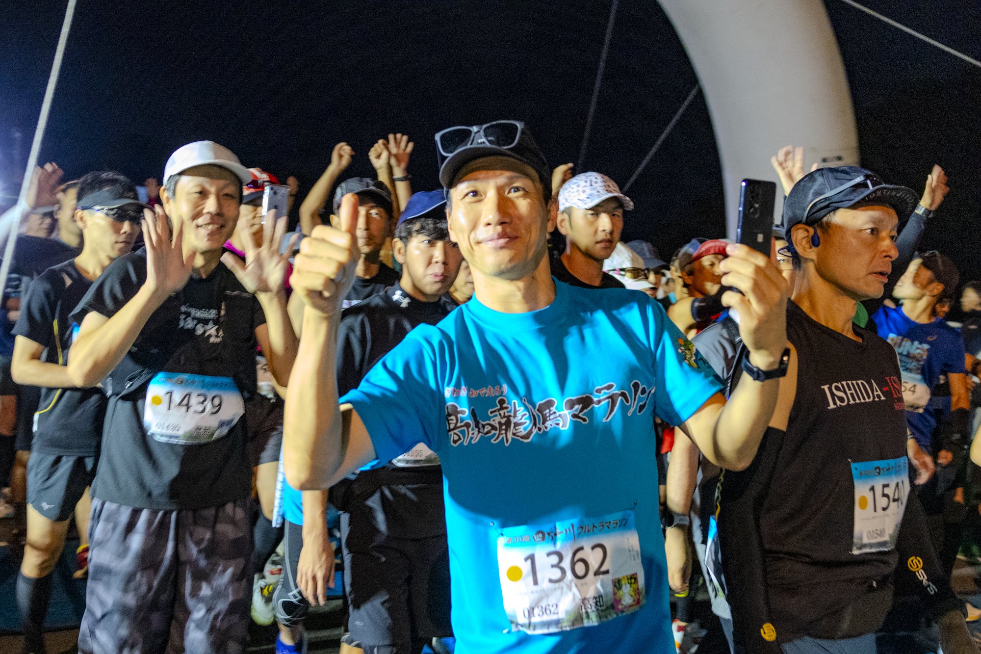 大會當天,在黎明前的早上,踏入四萬十川奧特馬拉松的起點舊蕨岡中學,驚訝的景象蔓延開來。在燈光照耀下的操場上,儘管還是黎明前的早晨,那裡已經聚集了1600多名跑壘員,我不由得屏住了呼吸。