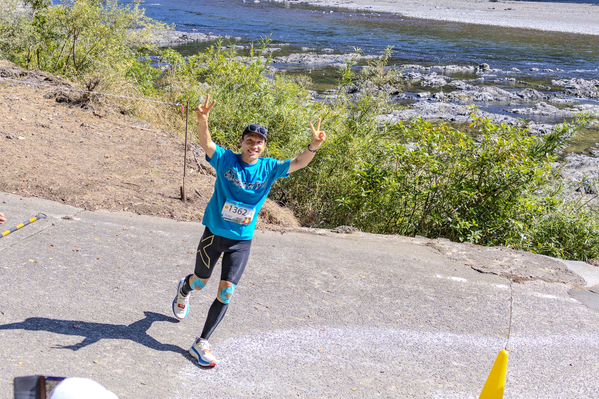我們在55公里處的四萬十川名產“沉降橋”等著Toby。“沉降橋”是設置在河面附近的沒有欄杆的橋,其特徵是大雨等漲水時會沉入河底。從河上奔跑的感覺和從沉降橋上眺望的美麗風景成為了跑壘員心中留下的景色,是這次大會人氣的理由之一。