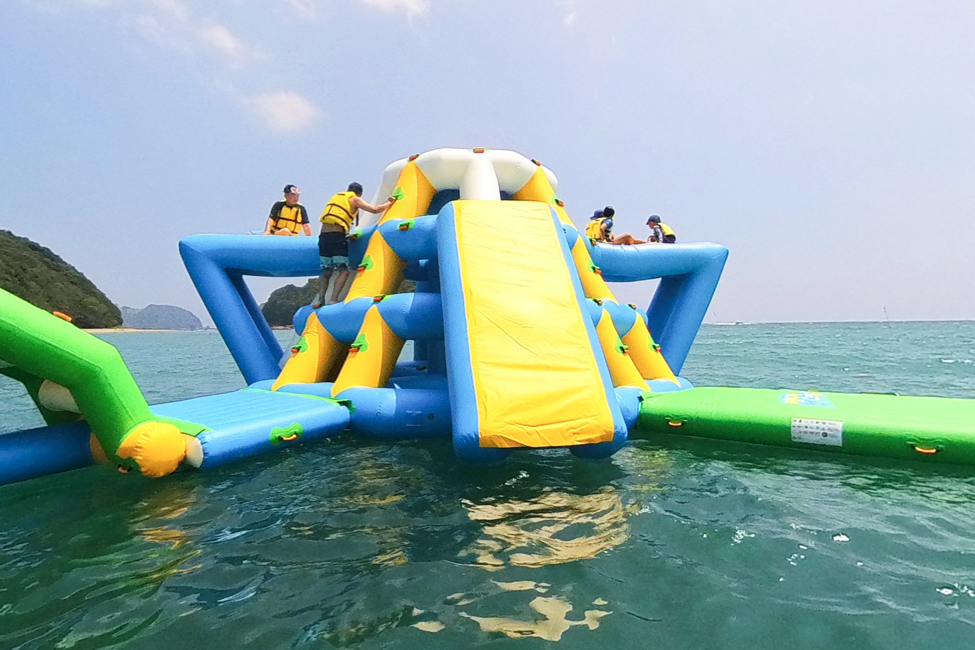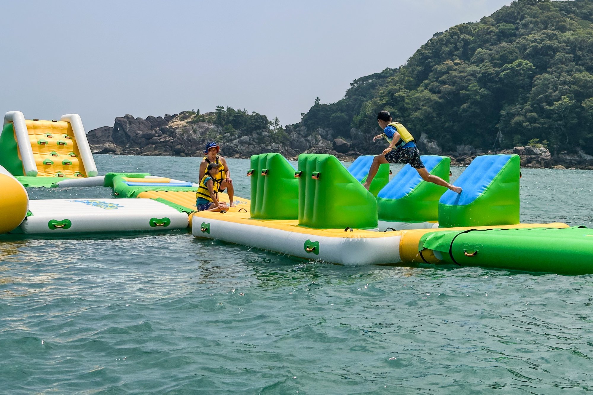 正因為海浪中搖搖晃晃的腳手架和濕滑的斜坡不能按照自己的想法進行,才有趣。就像大海上的遊樂園。當然,救生衣必備&監視員常駐,安全對策也萬全。