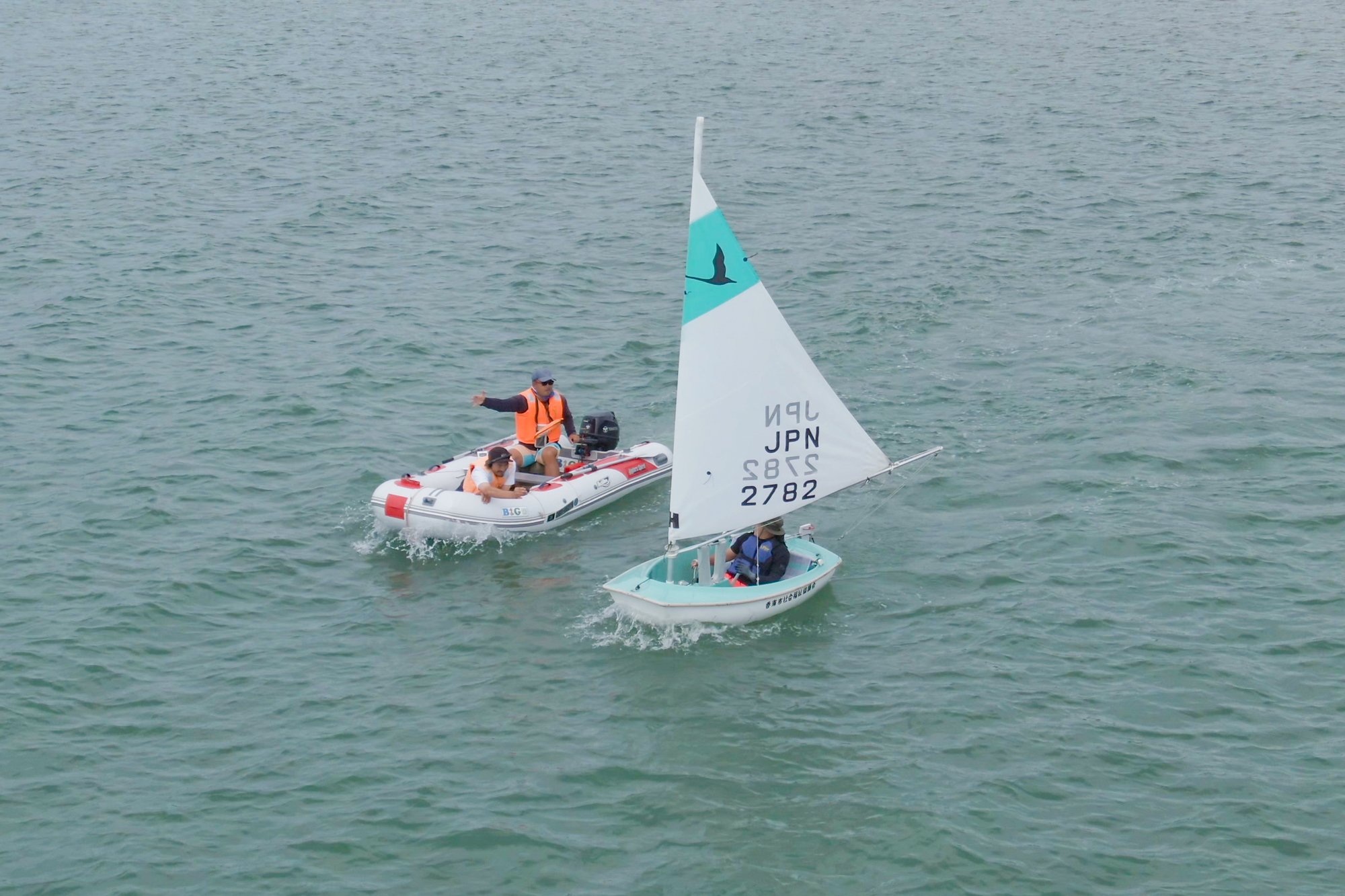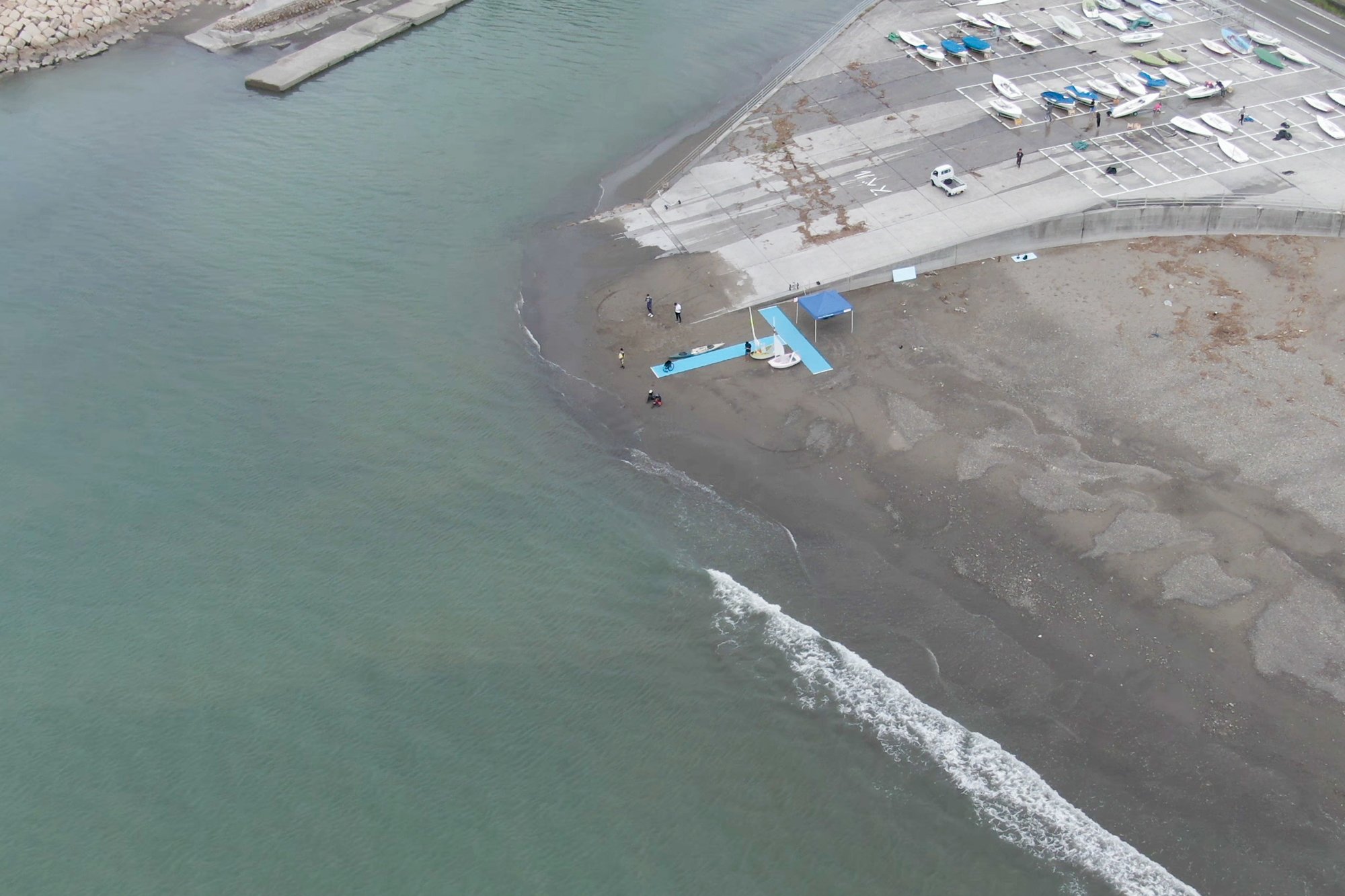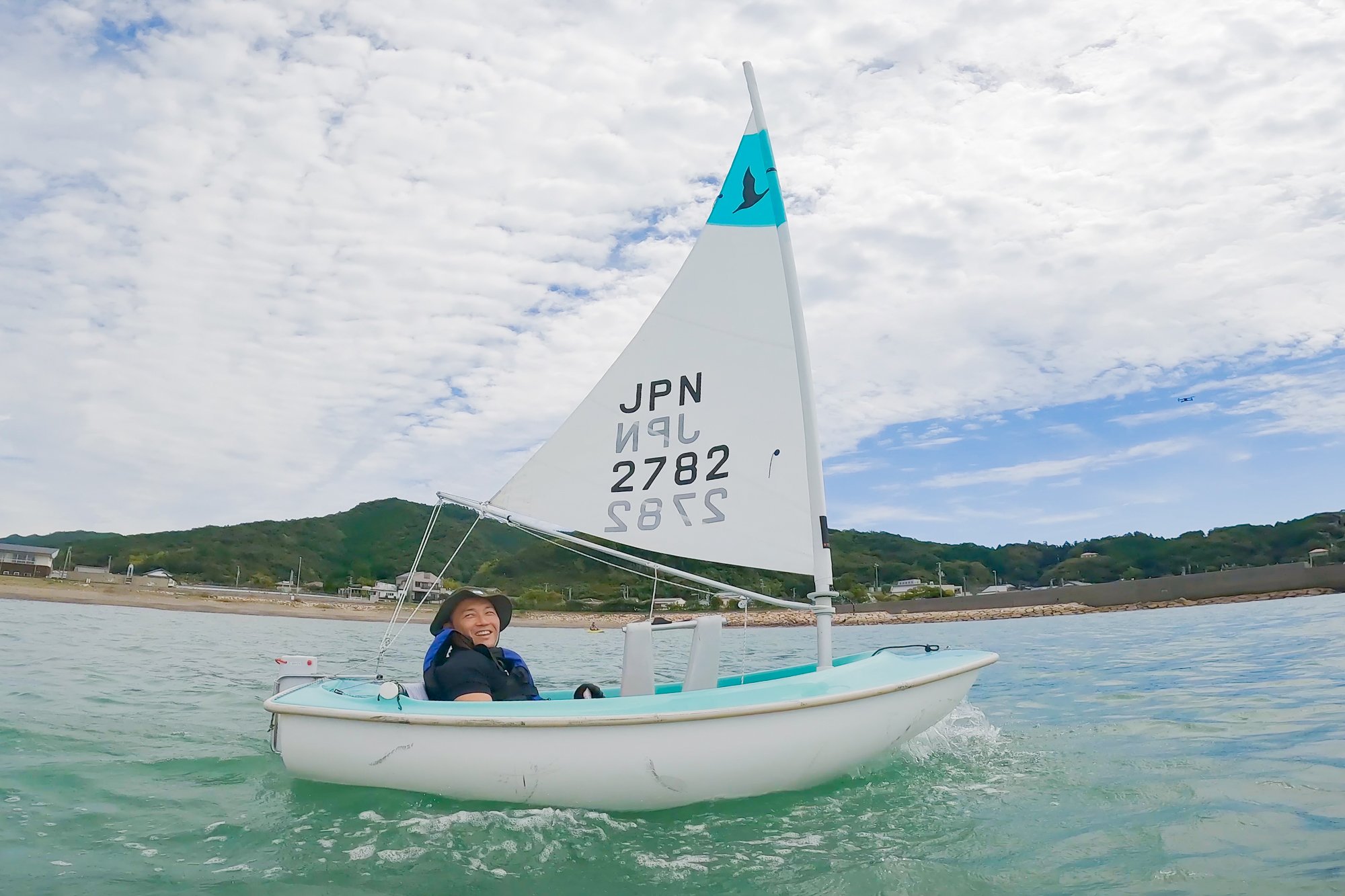 乘坐初學者用的小型帆船,4名工作人員抬起去海邊。工作人員指導操作方法,按照那樣行動的話迅速前進。