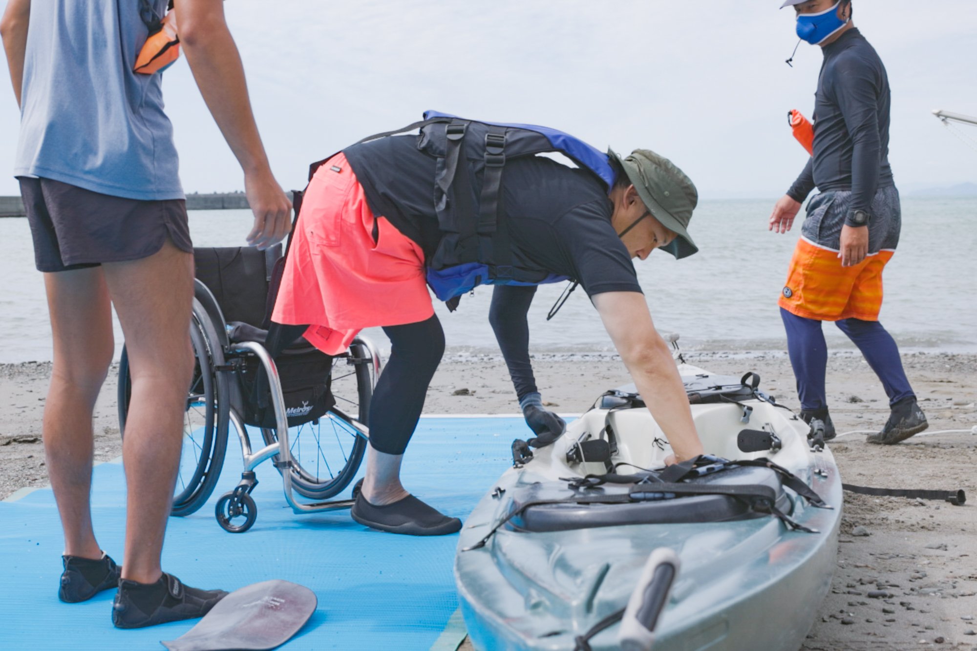 海邊鋪著坐輪椅也能進行的專用沙灘墊子。池先生移動到岸邊,坐上皮艇。