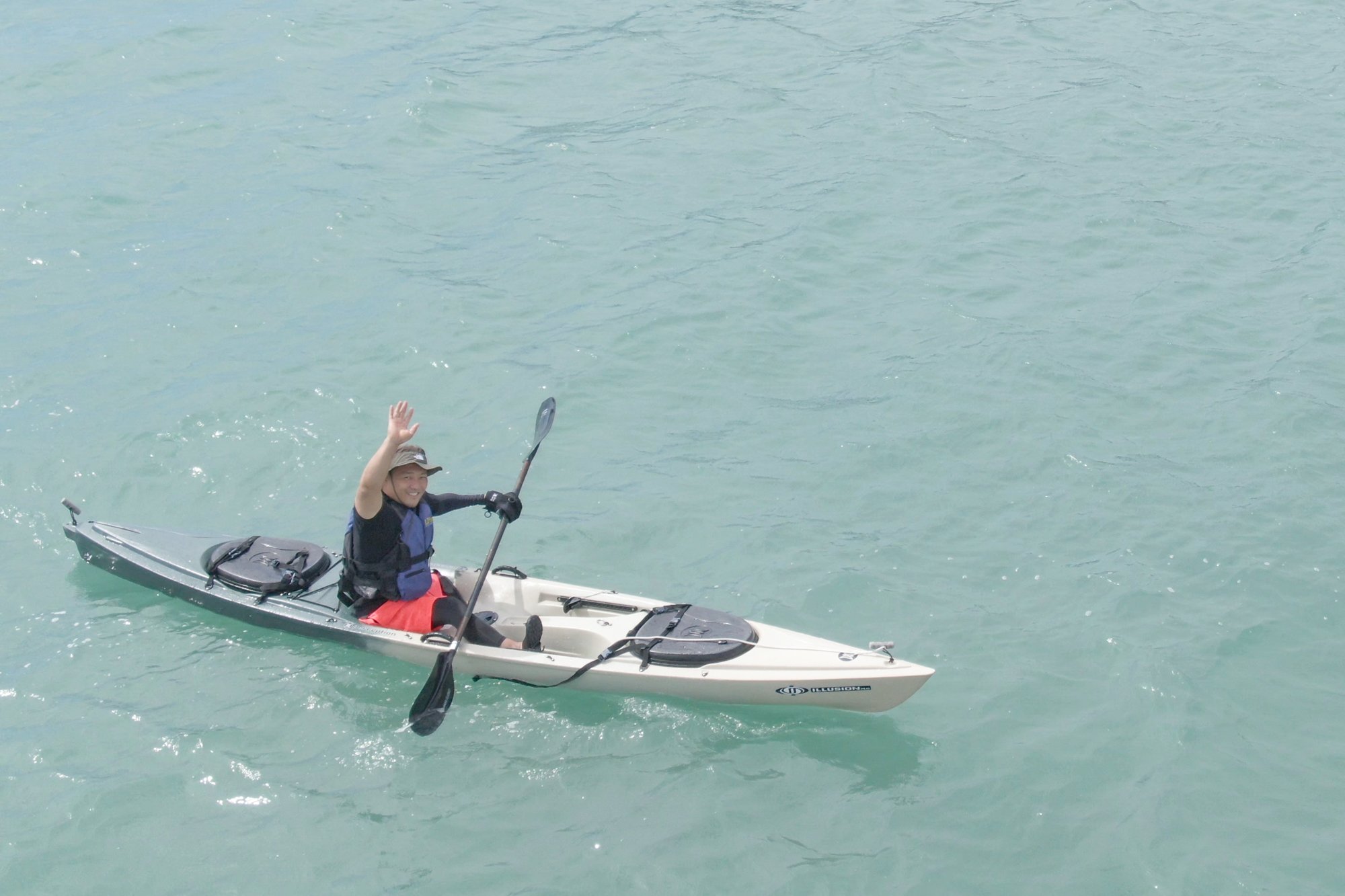 載著池先生的皮艇被4名工作人員抬起來著水,悠然自得地出發去海邊旅行。不愧是運動員,雖然是第一次皮艇,但是沒有翻覆地在海灣上搖搖晃晃地前進。