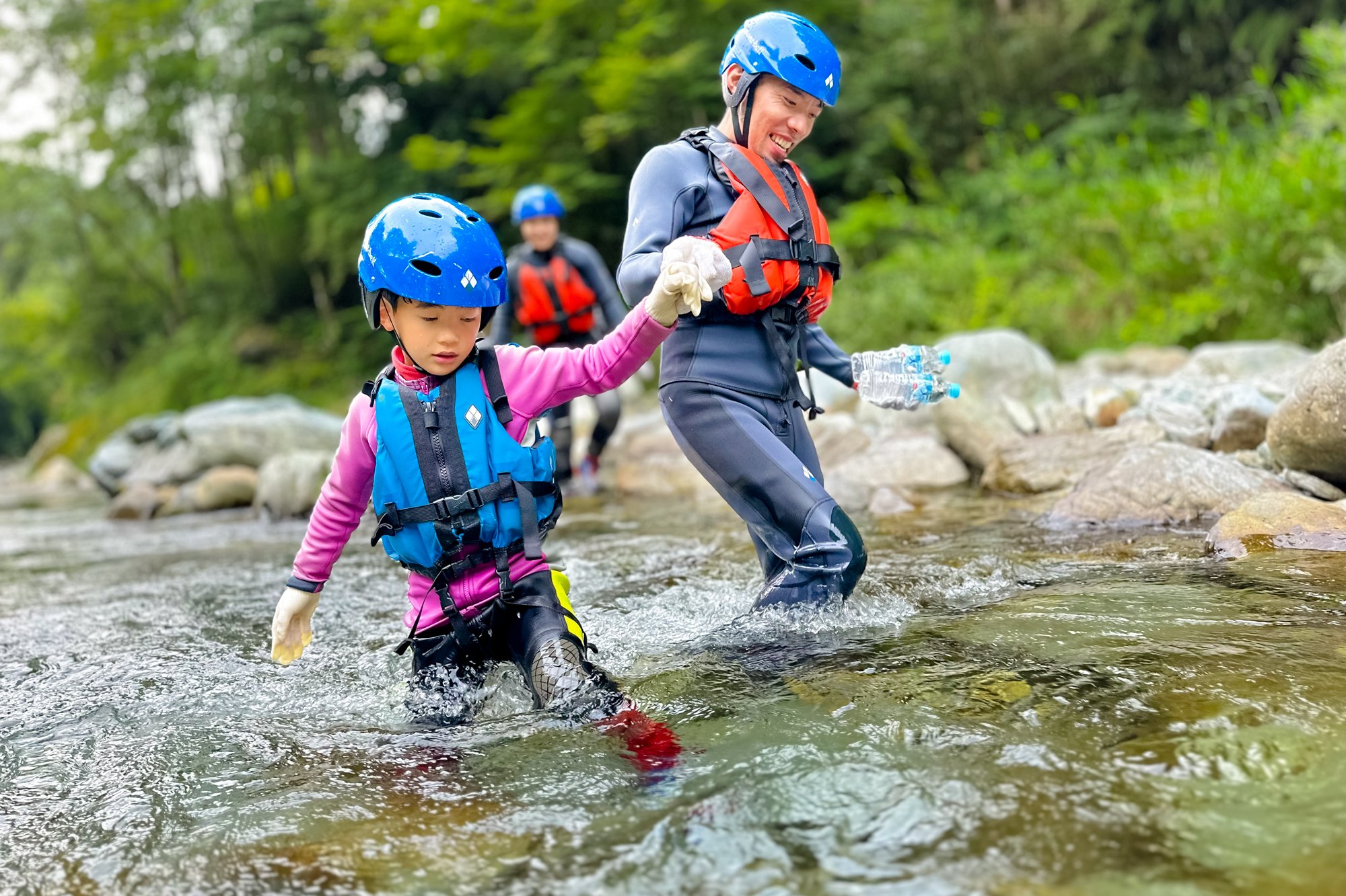 淋浴攀登(攀登山谷)是一個非常適合夏天的活動。在代表四國的清流之一吉野川的支流中,父子盡情享受了川游。