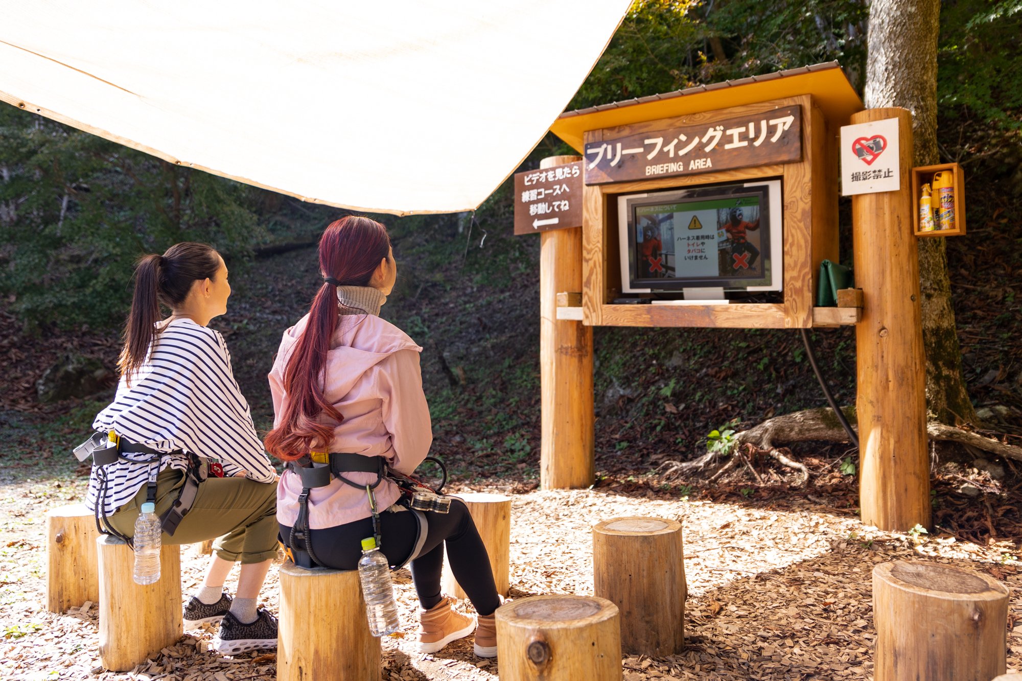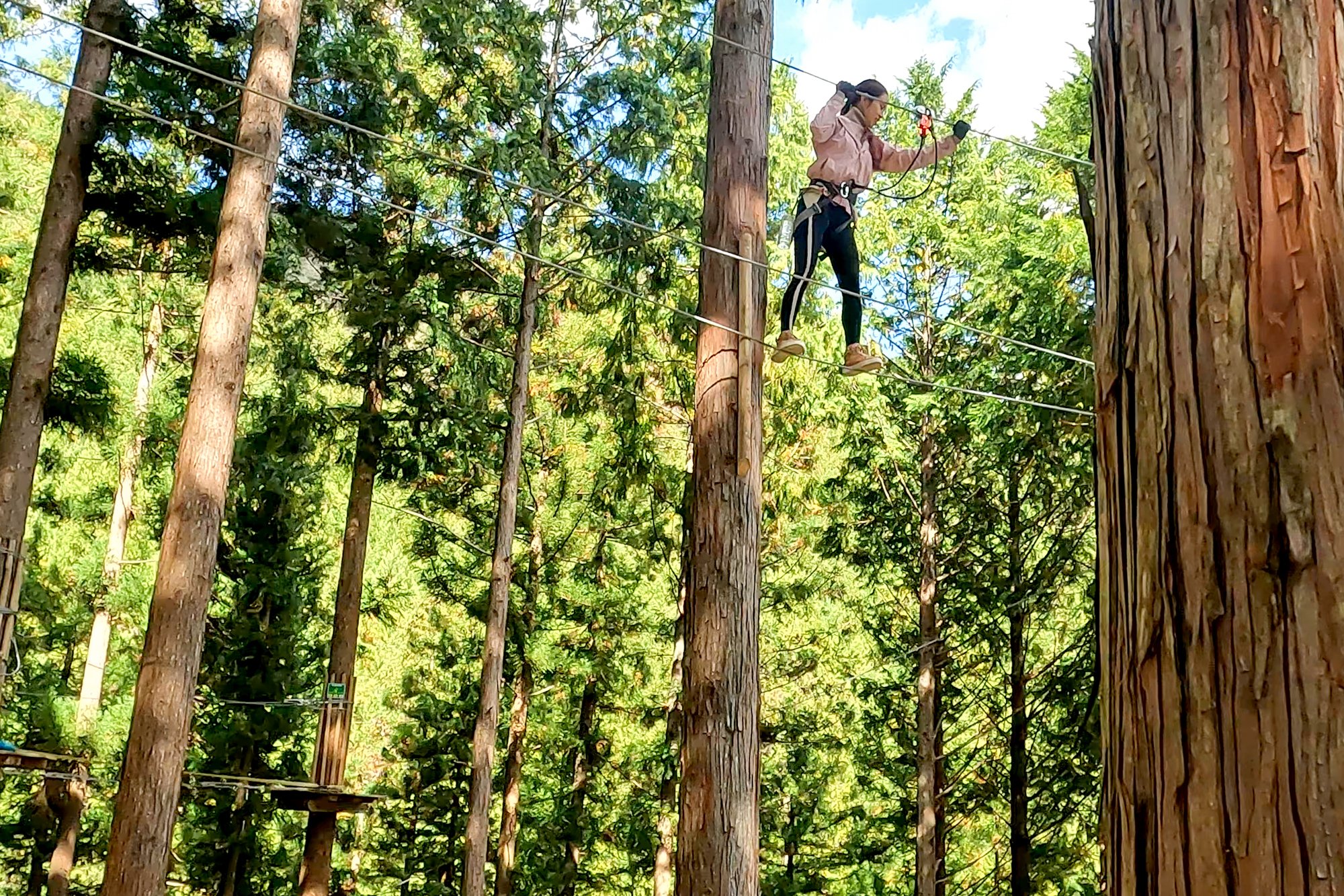 森林冒險在從樹上傳遞到樹上的繩索上自行移動。基本上,樹上的安全需要自己注意。在挑戰賽道之前,請好好確認安全器具的使用方法。