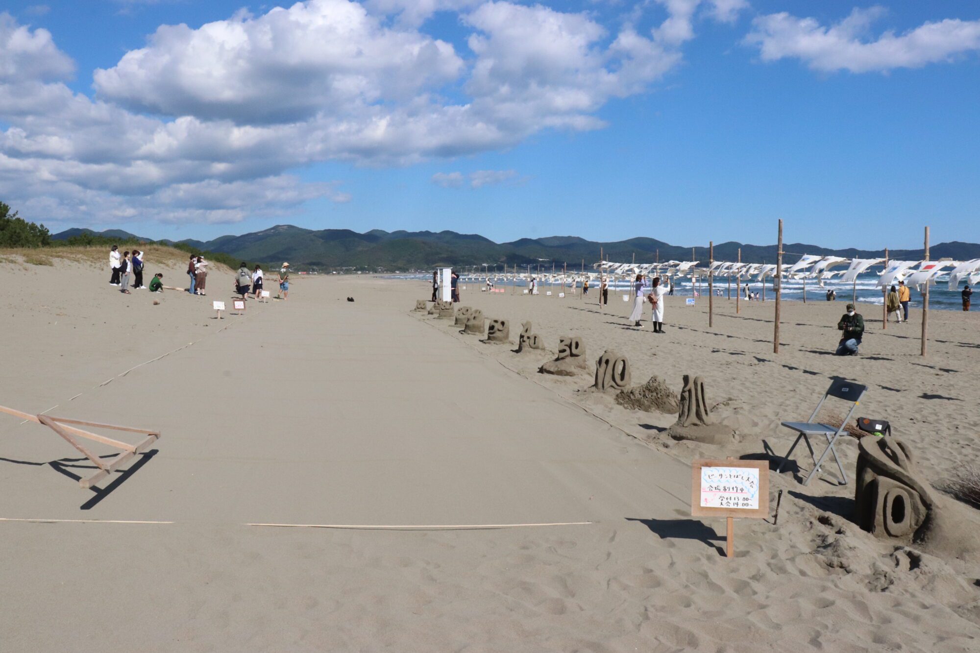 從高知IC駕車約1小時45分鐘。在高知縣黑潮町的入野海岸(入野之濱),黃金周的T恤藝術展舉辦期間舉行的“沙灘飛大會”。