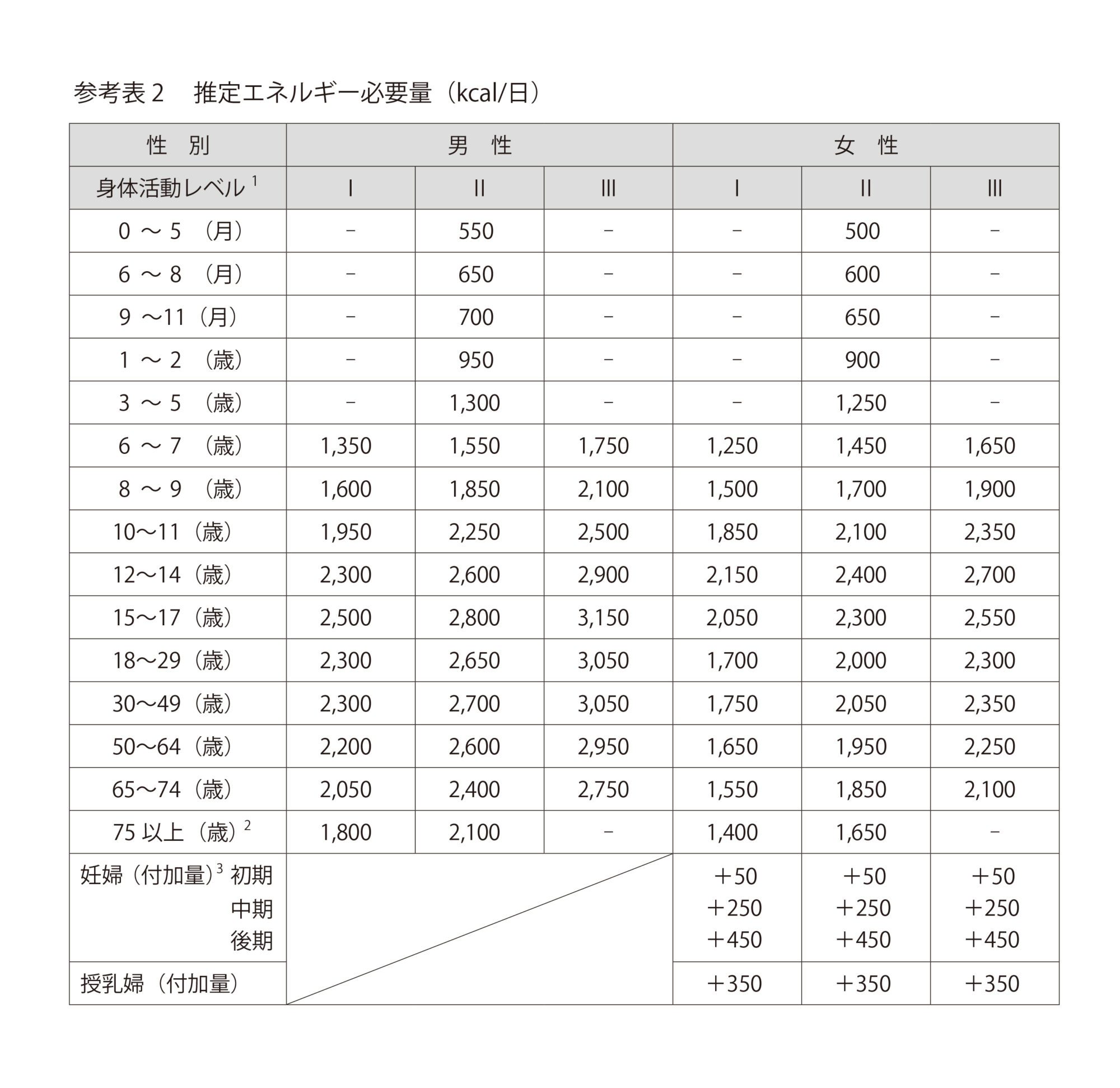 卡路里有通過吃飯等攝取的“攝取卡路里”和維持身體和運動等消耗的“消耗卡路里”。 因此,首先,了解一天生活所需的能量量=攝取卡路里吧。下面的表是從厚生勞動省的“日本人的飲食攝取基準(2020年版)中,摘錄了每天攝取的卡路里基準量。