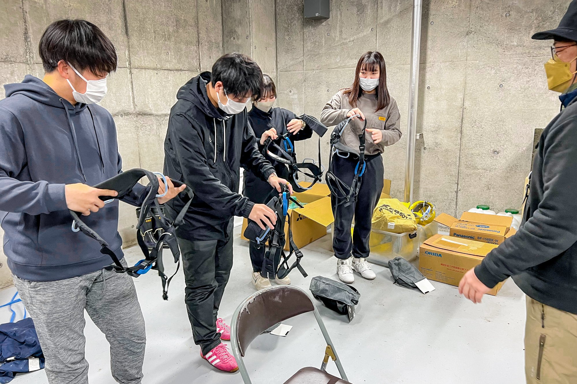 安裝專用的線束、鞋子、安全帽,安裝了奧托比雷(命綱)後,移動到作為攀岩路線起點的水庫外側。雖然有堅實的腳手架,但已經有相當高的感覺了。