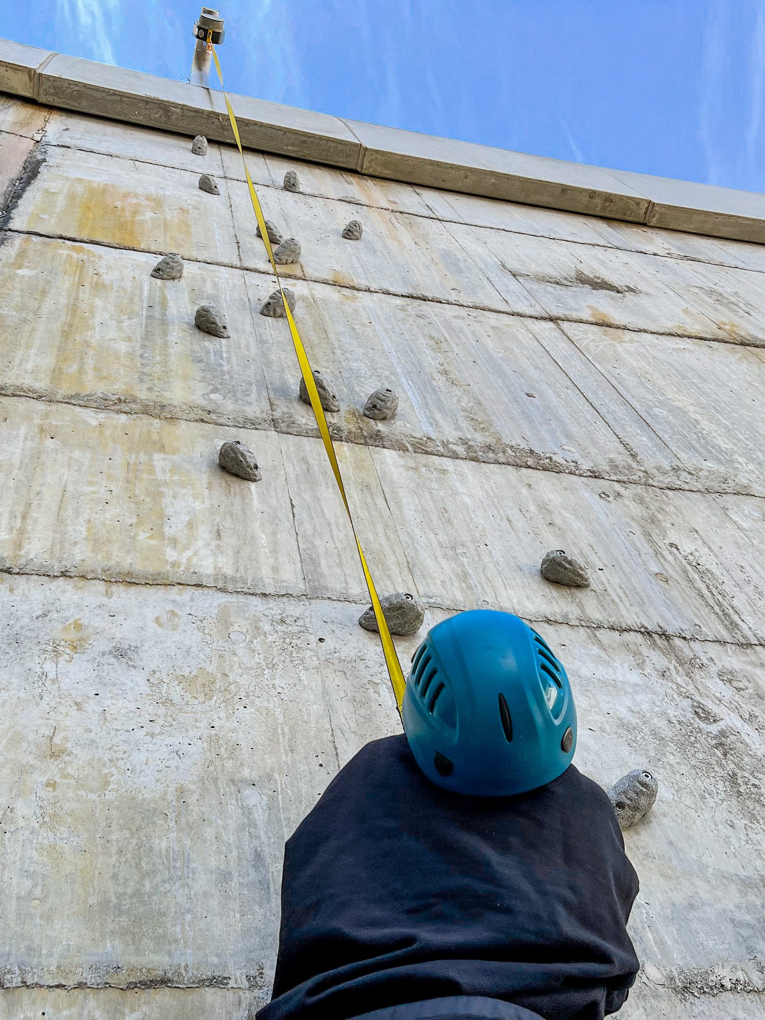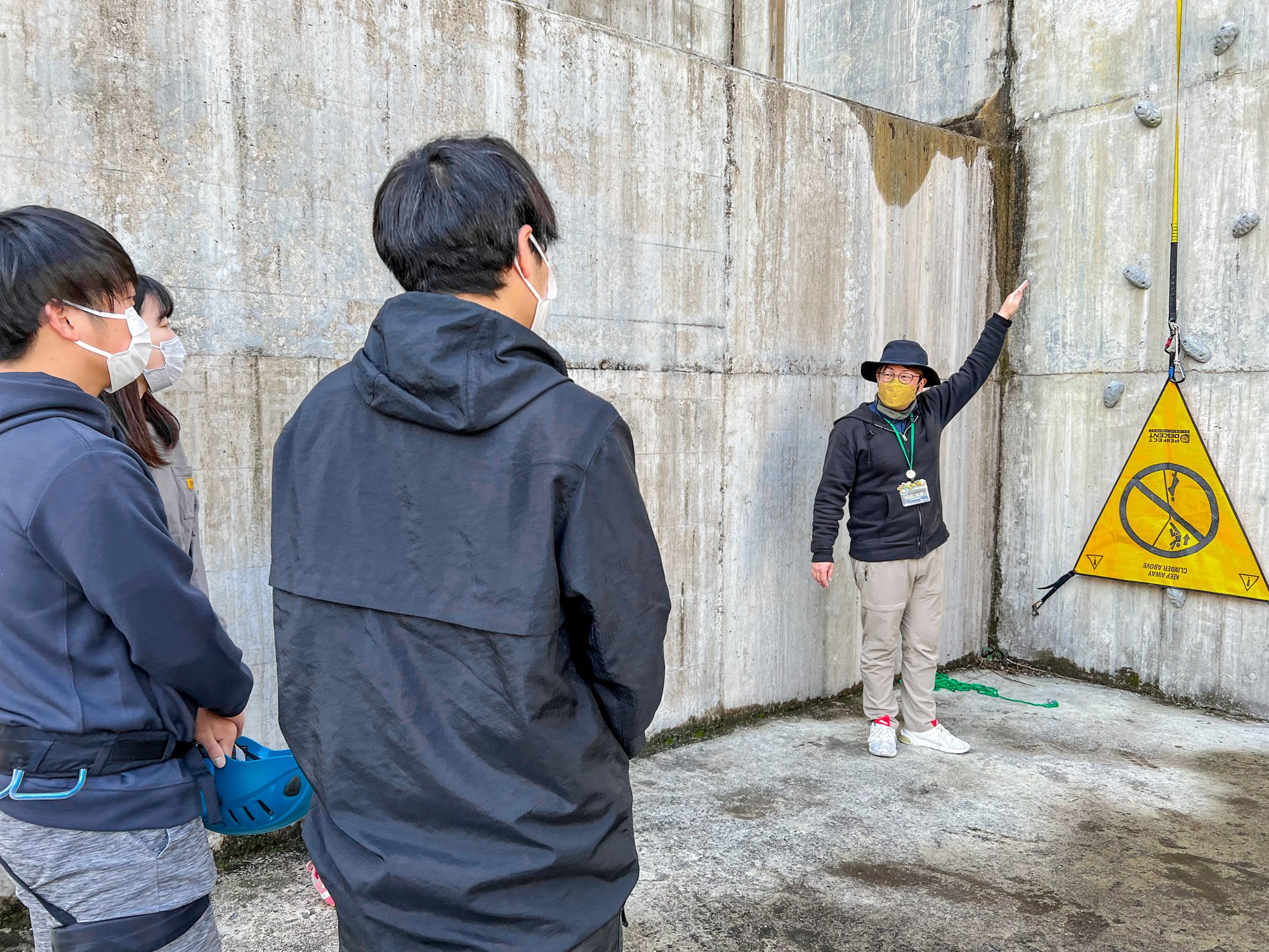與室內的攀岩設施不同,眼下廣闊的景色規模宏大。山頂附近距地面約70米。無論是看上面還是看下面,都會因為它的高度而顫抖。女性陣容中途差點退休了好幾次,但總算全體成員都登上了山頂。爬完後慢慢地沿著繩子下到起點。腳抵達地面時的成就感和放心感也不容錯過。