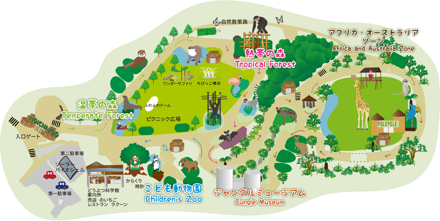 生活著約100種1100種動物的一動物公園。園內約20公頃,由“溫帶森林”、“熱帶森林”、“非洲·澳大利亞區域”、“叢林博物館”4個區域和“兒童動物園”組成。聽說20公頃的話,“走路好像很辛苦!”也許會這麼想。但是實際上,慢慢地走兩個小時左右就可以繞一周了。