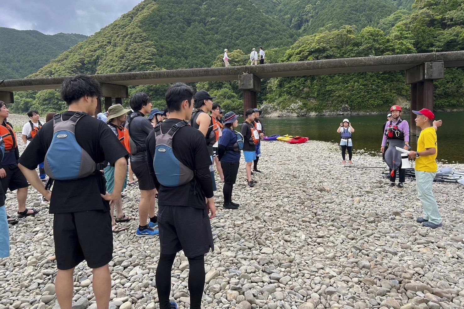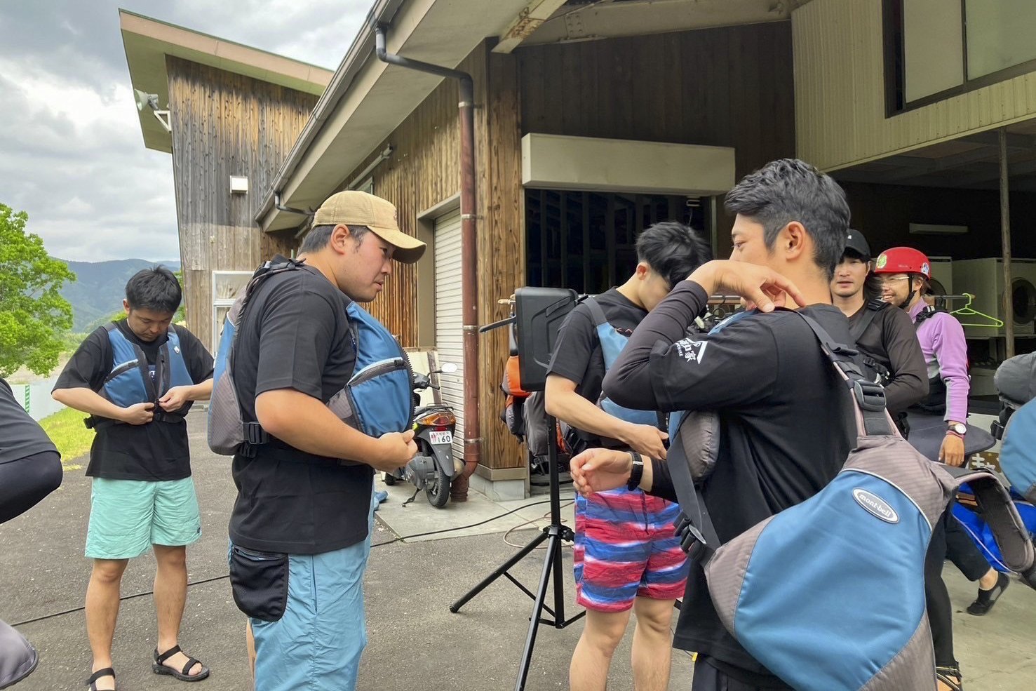 穿著救生衣,全5支隊伍的成員在四萬十川沿岸的道路上被巴士搖晃了5分鐘左右,到達了上游的起點。