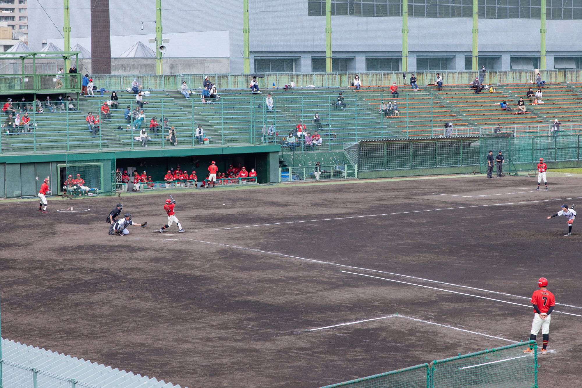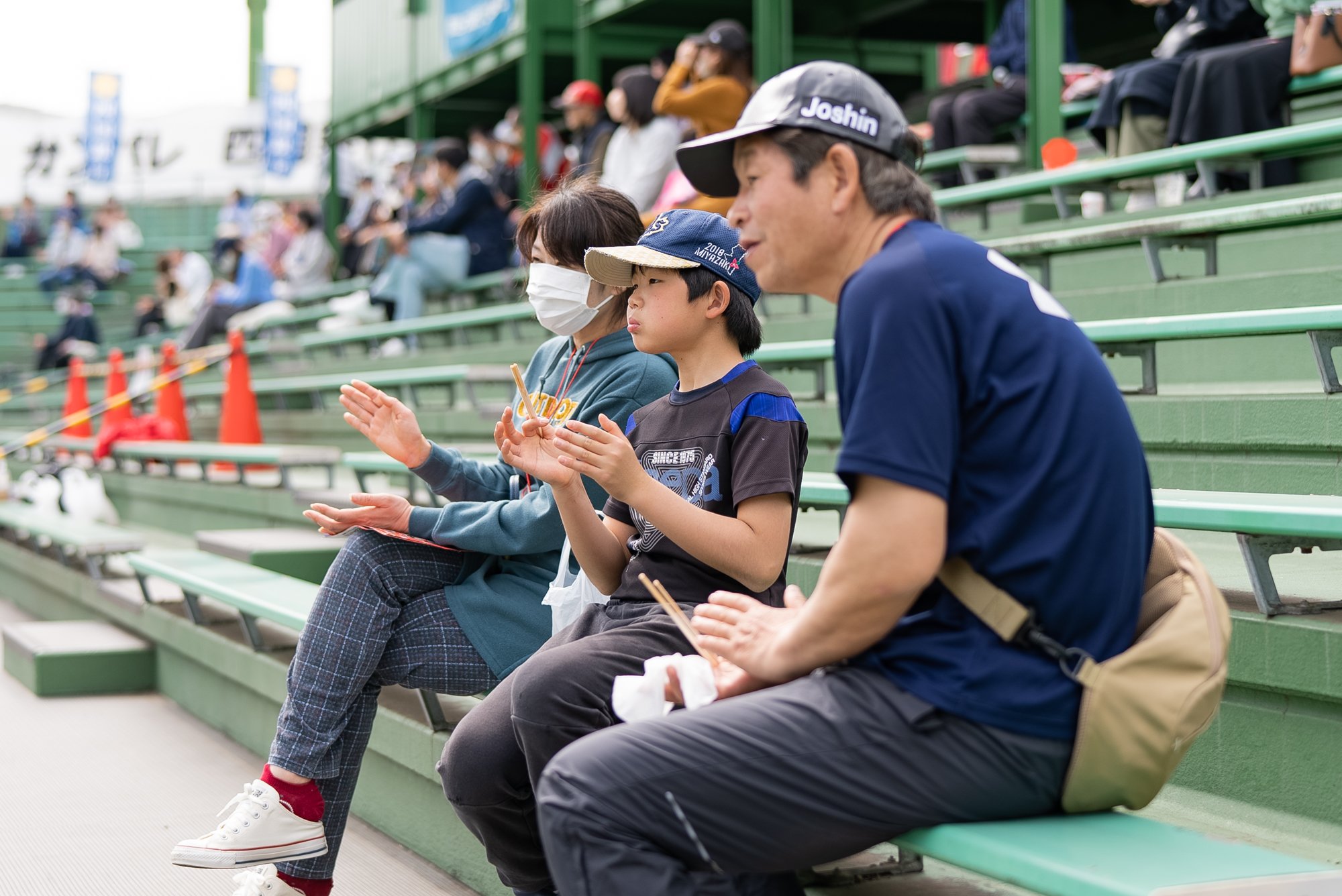 體驗結束後的參加者們,在看台觀看了從中午開始的高知Fighting Dogs vs四國銀行的比賽。觀眾席在春天的陽光中,帶著便當、下酒菜、飲料來享受的家人和團體熱鬧,氣氛非常緩慢,但是選手們和剛才的相反,表情緊張地站在投手土台上。
