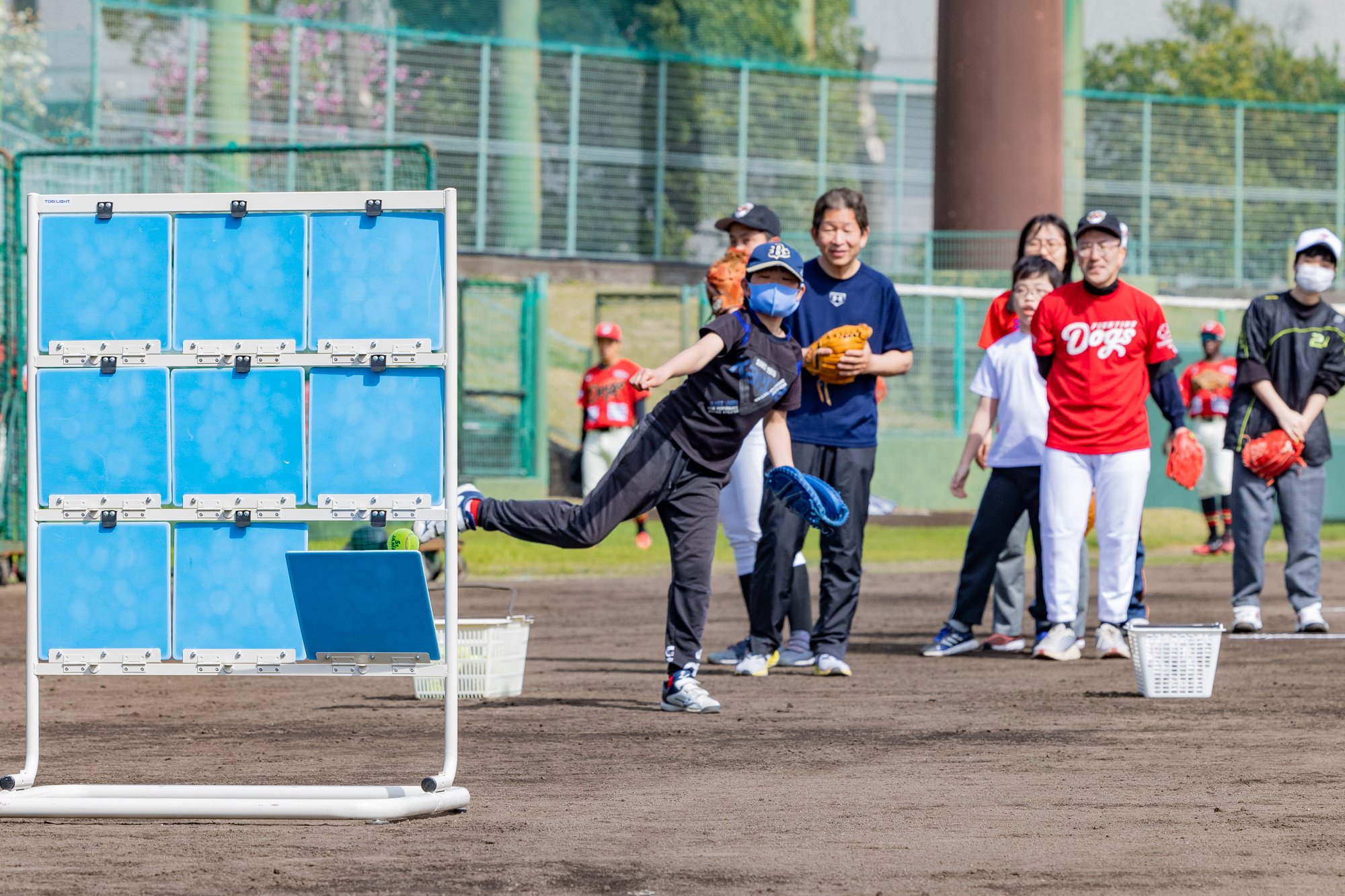 在體驗投接球的同時進行的敲門體驗中,玉井和江川組合發揮了實力。用輕快的動作捕捉鳥井弘樹選手、聖弗拉西納選手一個接一個地被放出的敲門,快速地投擲。“好球!”“好動作!”受到專業人士的表揚,臉上露出了喜悅的表情。