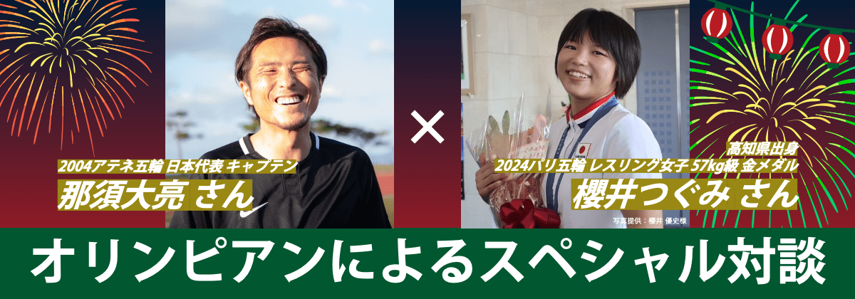 在2004雅典奧運會上,作為足球日本代表隊隊長率領的那須大亮和在2024巴黎奧運會上以女子角力57kg級出場,作為高知縣出身的選手時隔92年再次獲得金牌的櫻井惠決定了特別對談。