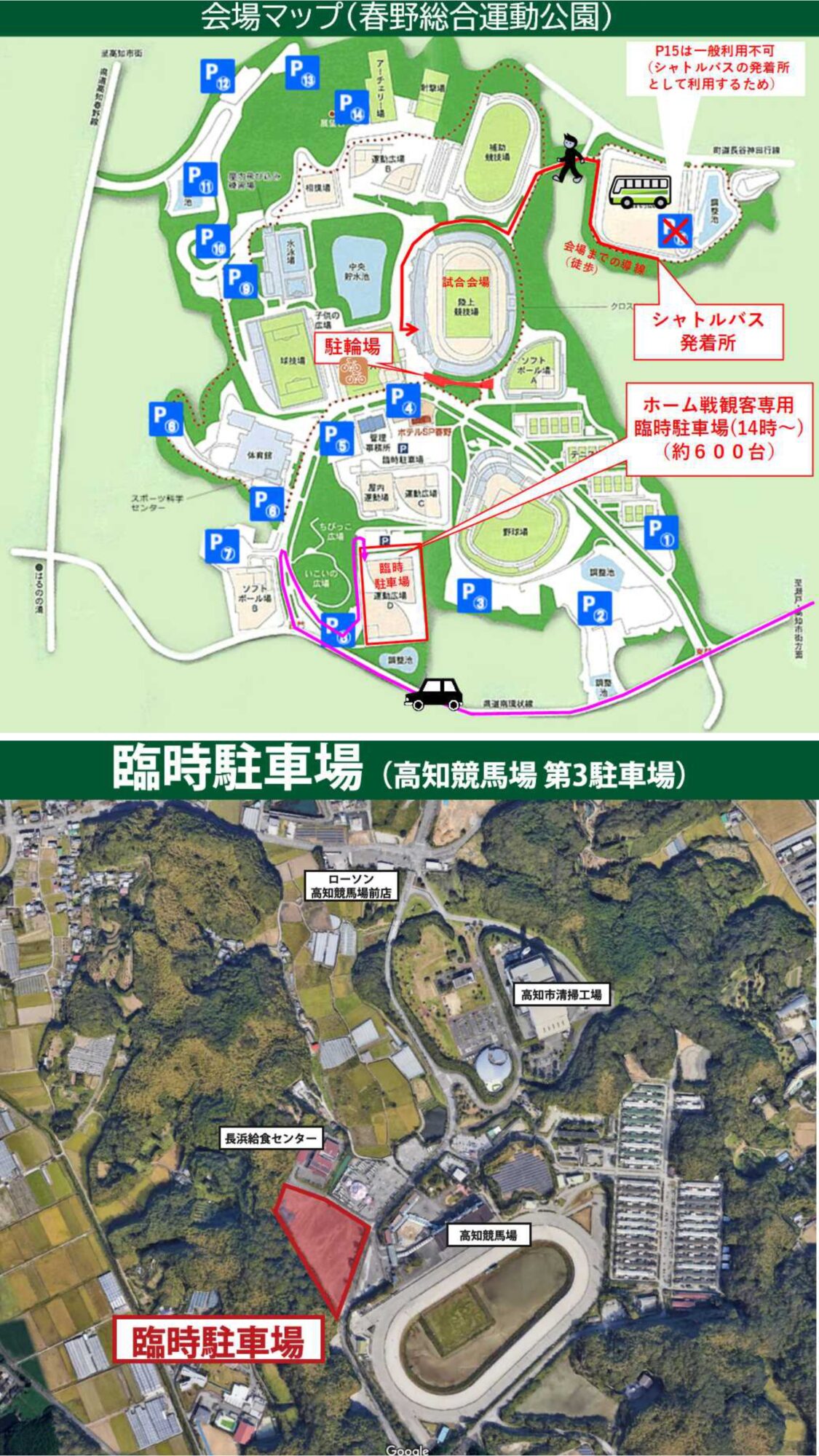 春野運動公園廣場D(約600台以上)的臨時停車場,作為高知聯合SC的主場戰專用從14點開始開放,觀看比賽的各位,請積極使用。