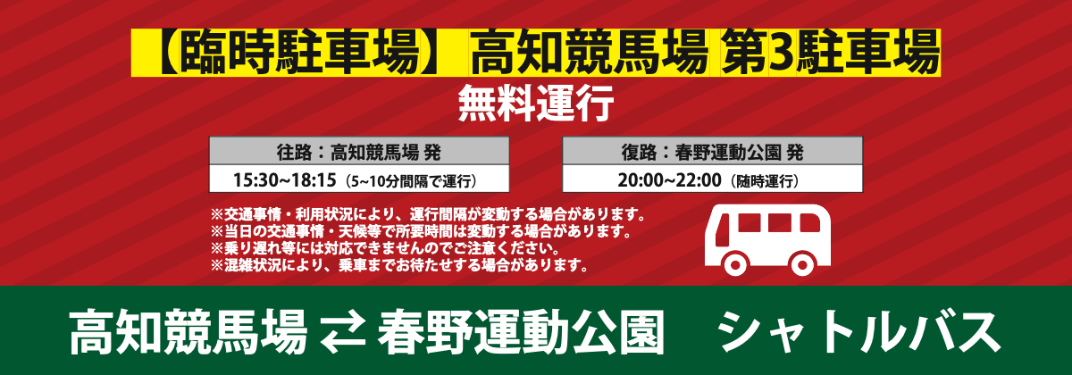 春野運動公園廣場D(約600台以上)、高知賽馬場(約750台)作為臨時停車場開放。