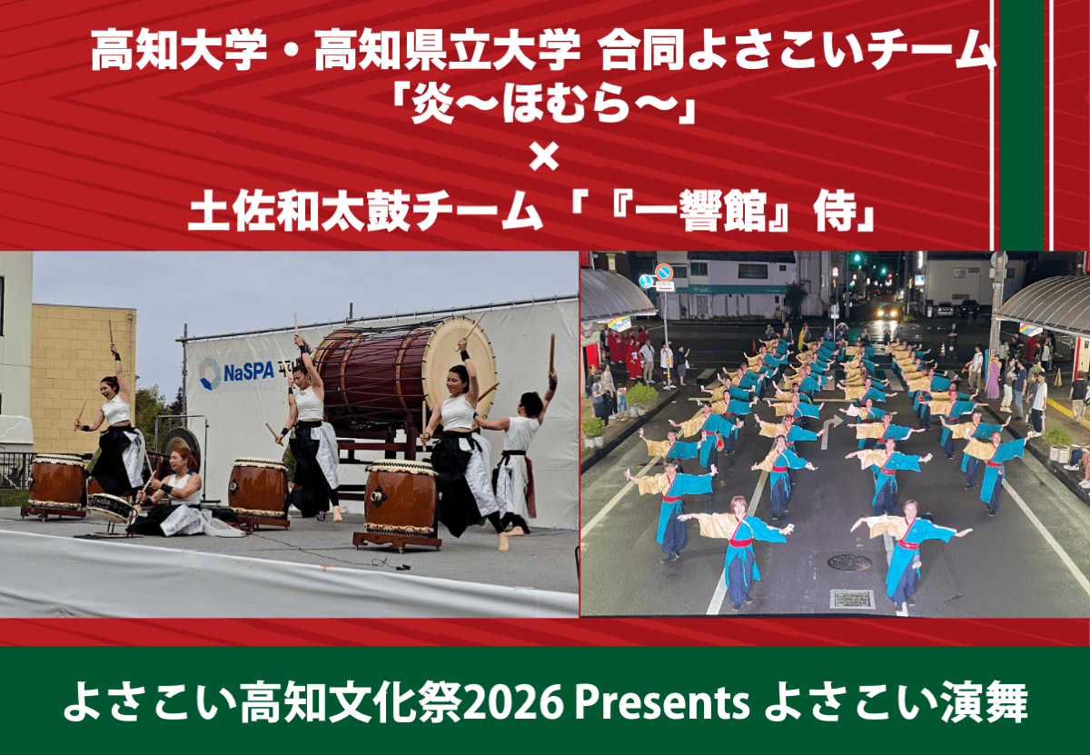 這次,作為明年10月在高知縣首次舉辦的國內最大級別的文化藝術盛典“YOSAKOI高知文化節2026”的宣傳,高知大學和高知縣立大學聯合的YOSAKOI隊“炎~ほむら~”和土佐和太鼓隊“一響館”武士”合作,特別舞蹈表演表示。