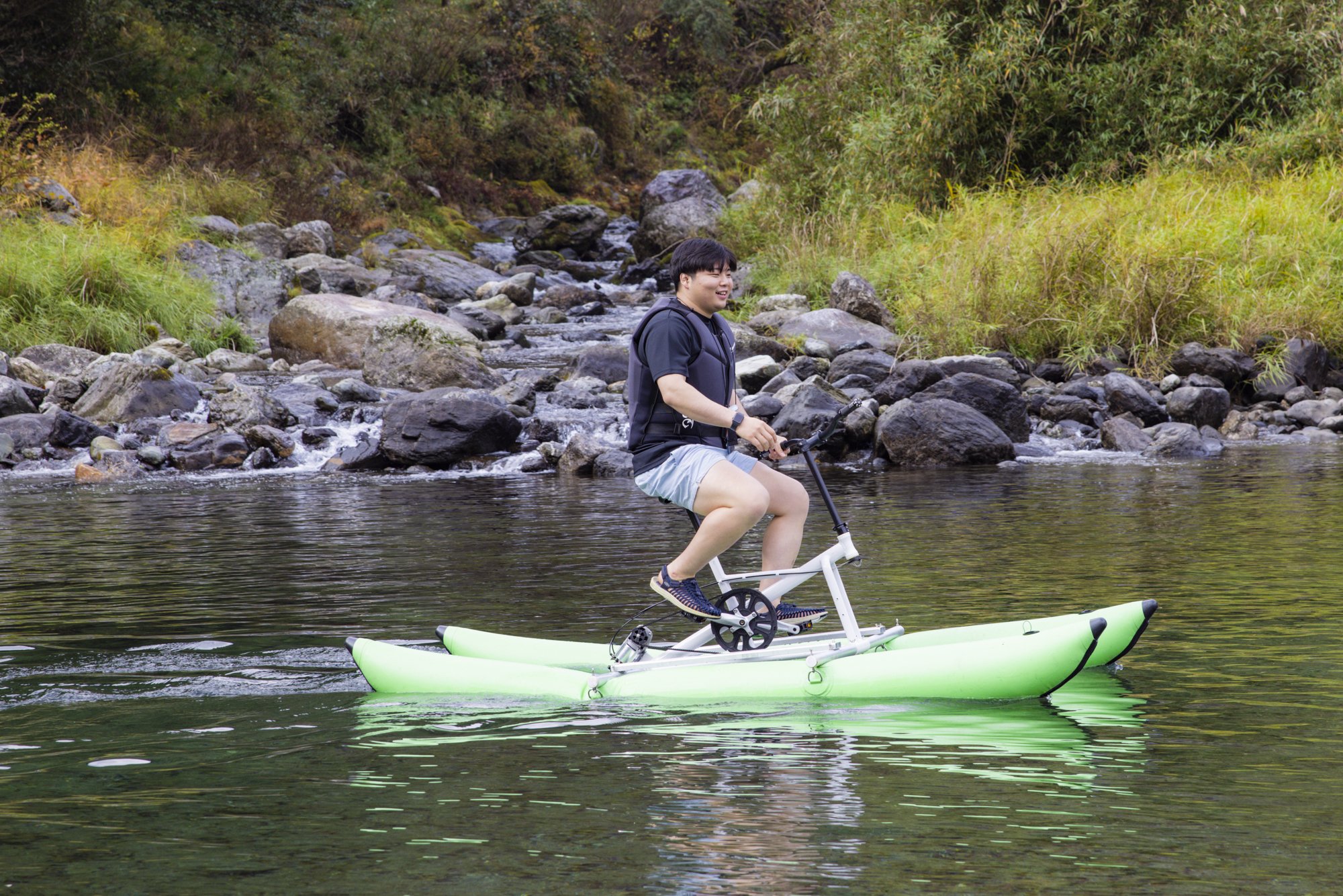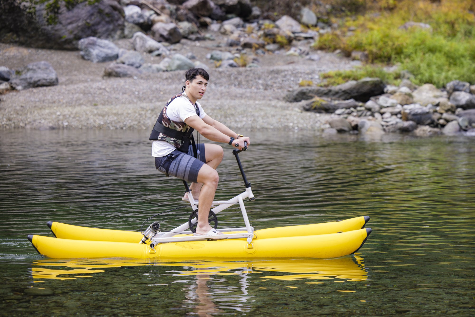 高橋選手和齊本選手挑戰了水上自行車。“操縱起來很難。不走自己想的方向”“雖然不能像普通的自行車那樣,但是很開心”。