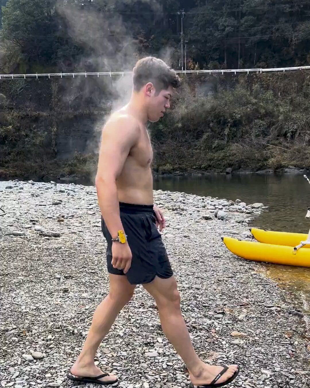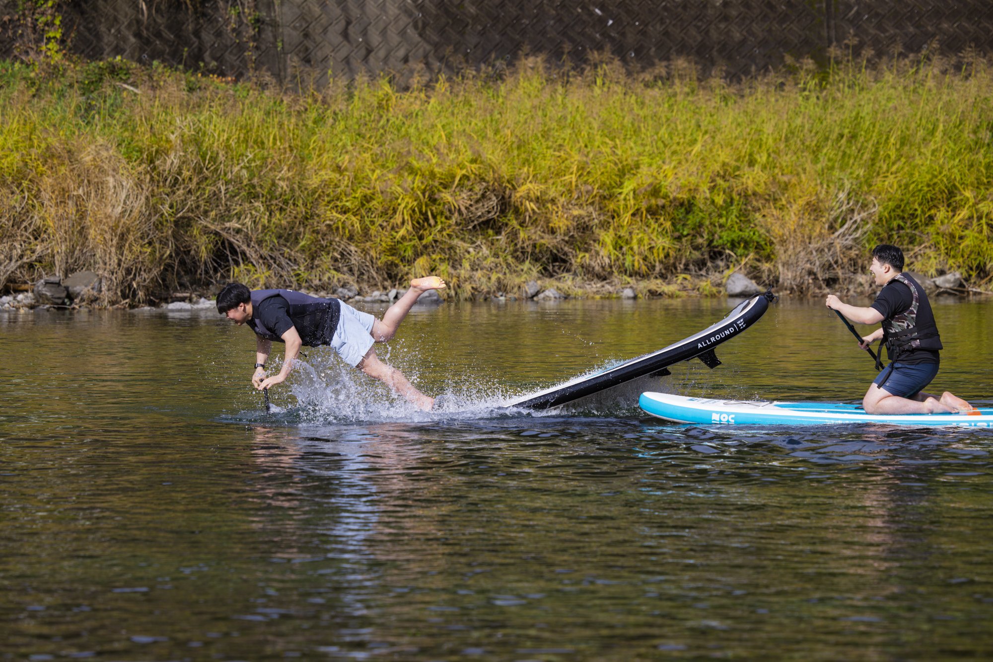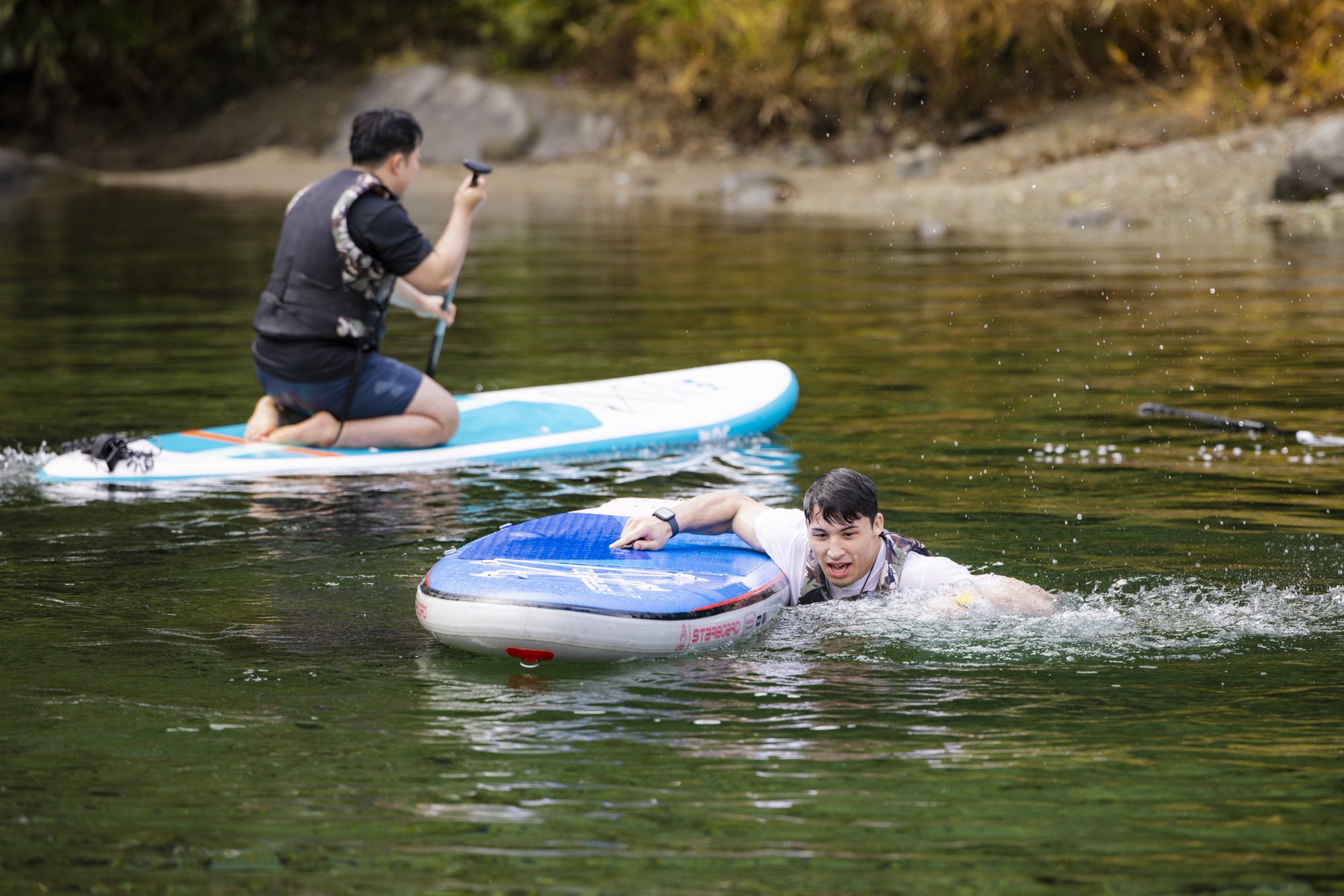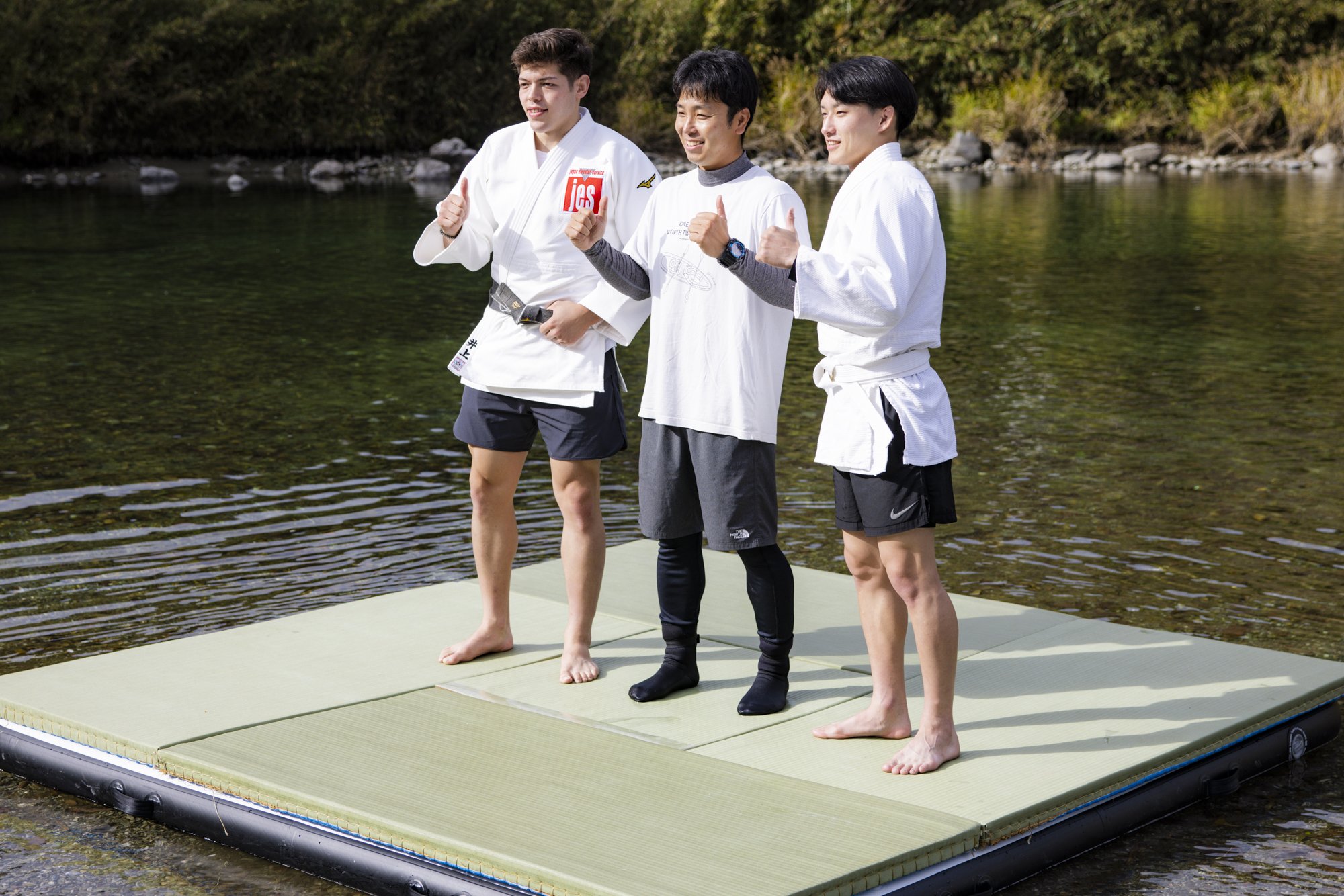 選手們也挑戰了SUP。正因為平時就在鍛煉,所以要馬上站著劃槳。在這樣的情況下,服務精神旺盛的金野選手進入了水中!在河灘上守護的導演和經理人非常興奮。然後金野選手對高橋選手和齊本選手惡作劇,破壞了平衡,漂亮地全員進入了河裡。一邊笑著一邊回到河原的選手們,用桑拿溫暖著身體。