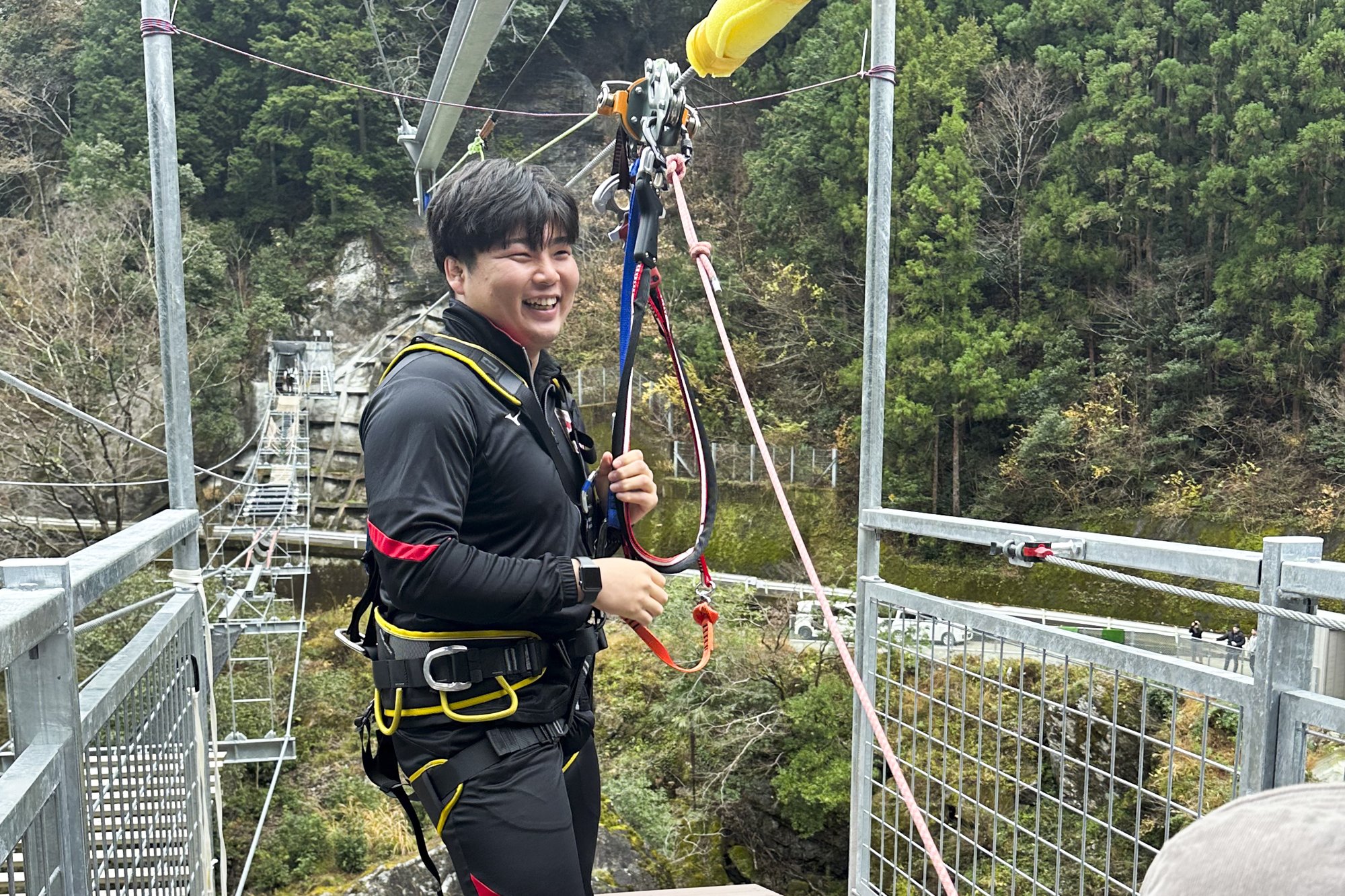 村尾選手說:“我小時候來過高知一次。是四萬十川那邊嗎?我想起了那個。今天也沒有體驗過的拉鏈,所以很開心”。