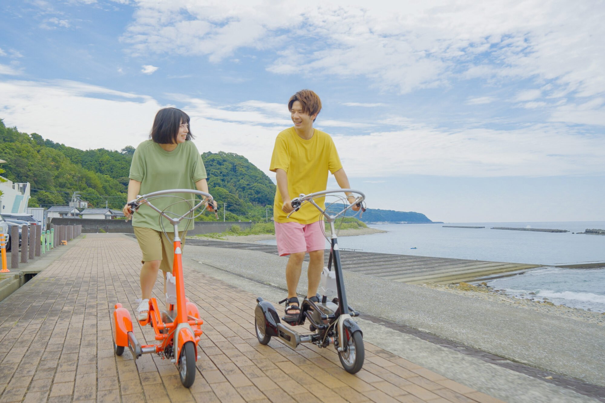 到達眼前是大海廣闊的“奈半利町海濱中心”後,像走路一樣踩踏板,比自行車更容易騎的“散步自行車”,和機動性巴茨根的“電動腳板”一起玩吧!