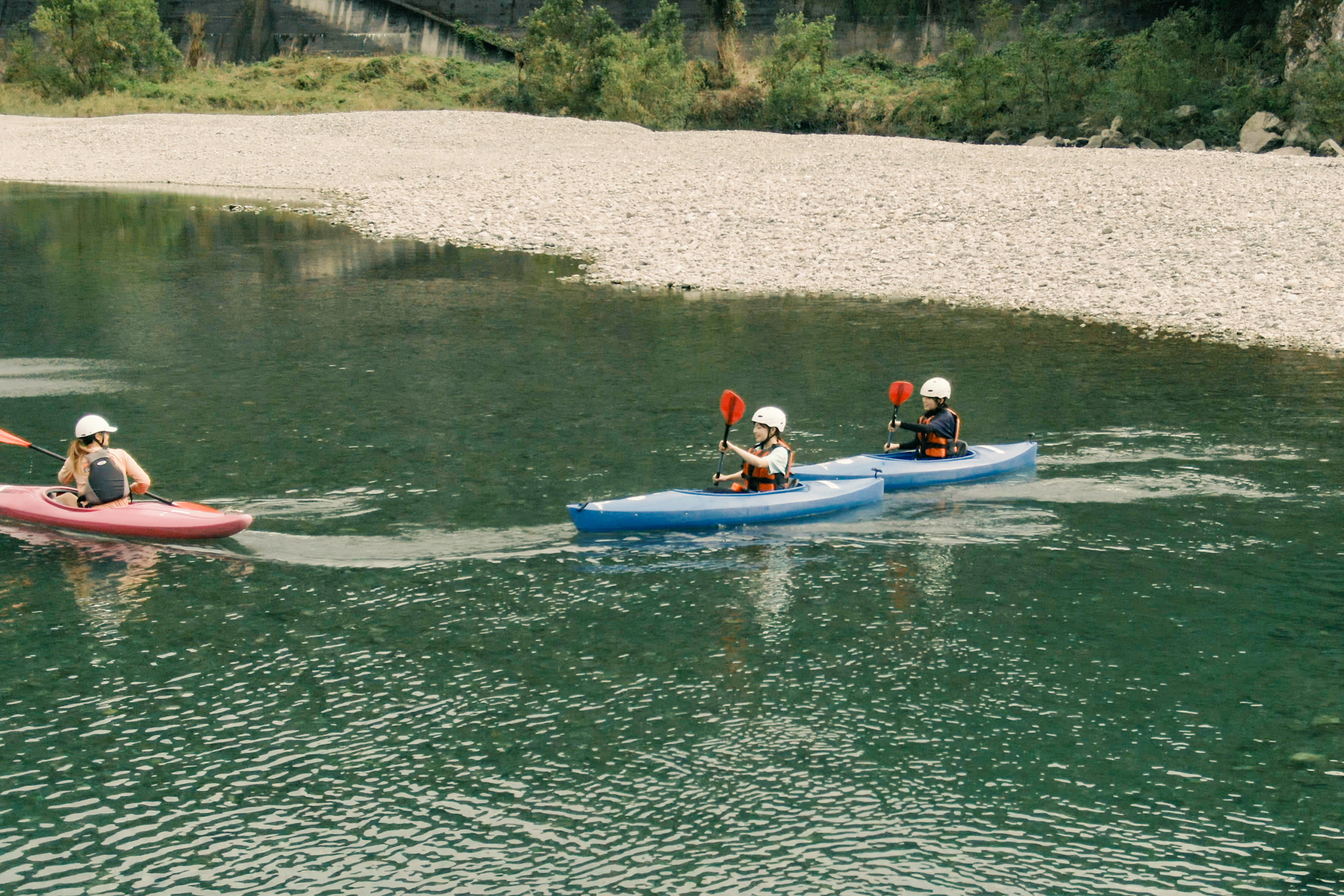 從教練那裡接受了基本的皮艇操作和注意事項的演講,和皮艇一起去河裡。這是一個優雅的散步的開始。