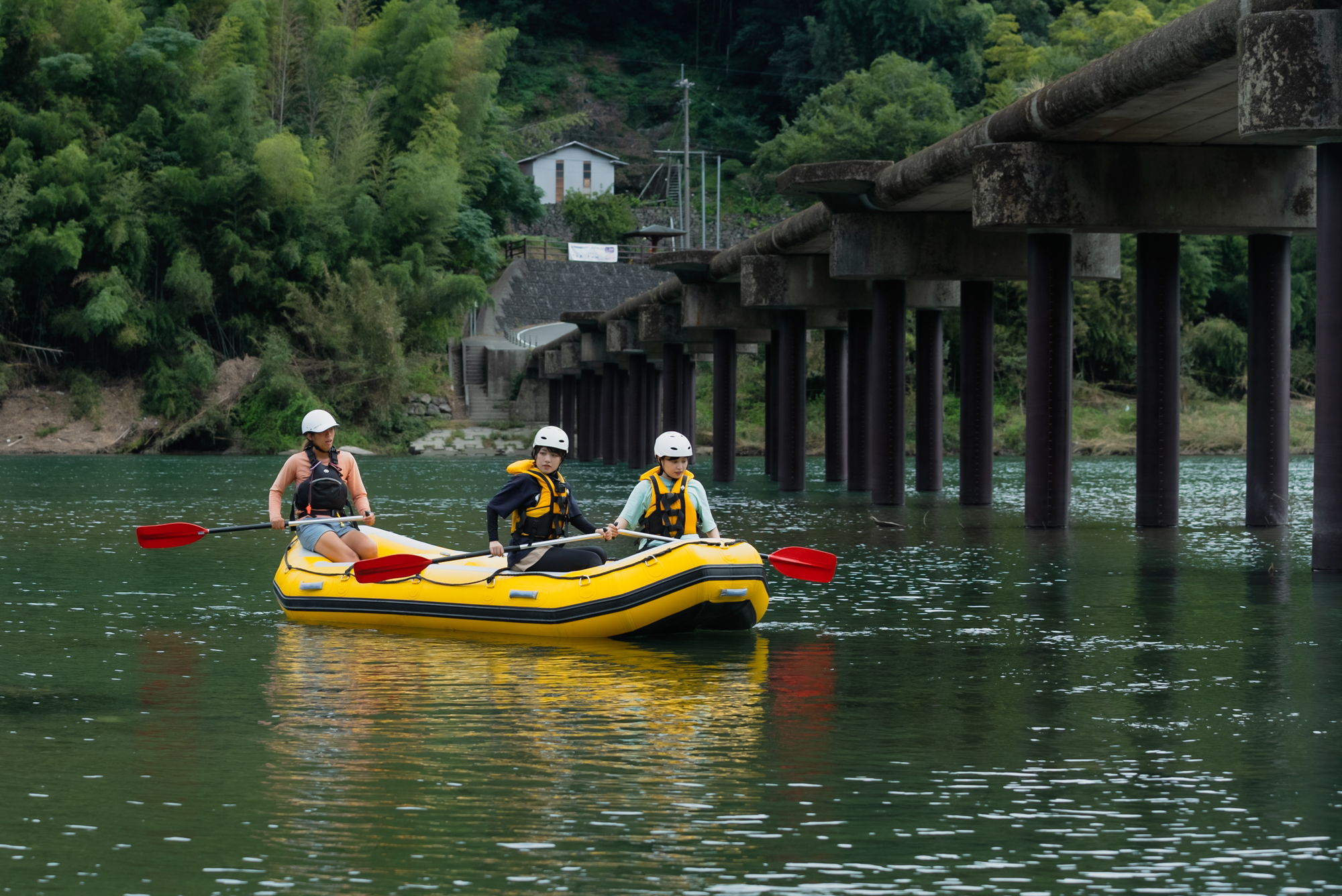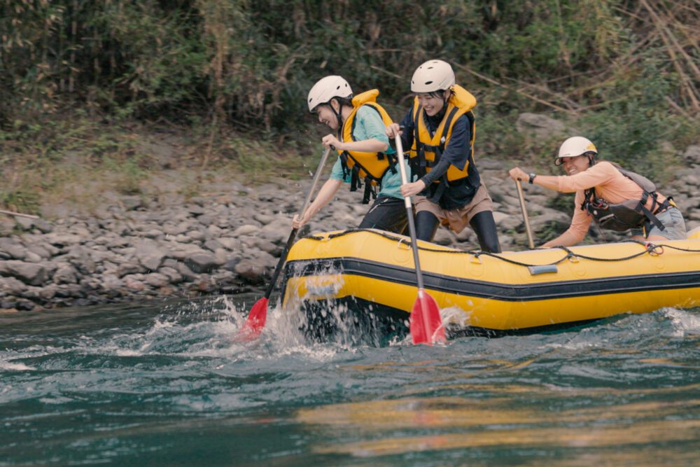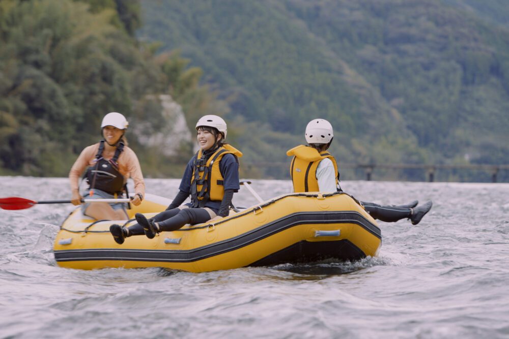 第2天,和皮艇一樣,乘坐利物浦挑戰漂流!乘坐大型橡皮船從仁淀川下來,全身心地與清流嬉戲的活動,可以享受到與皮艇不同的歡欣雀躍。