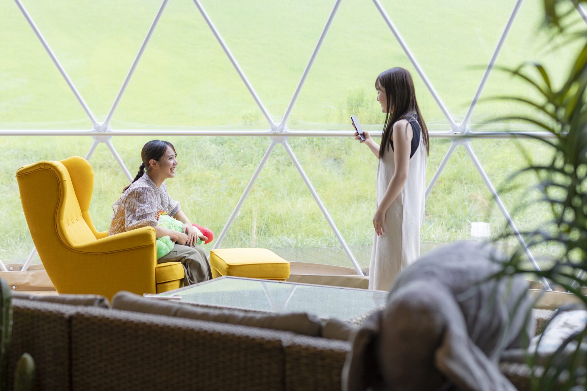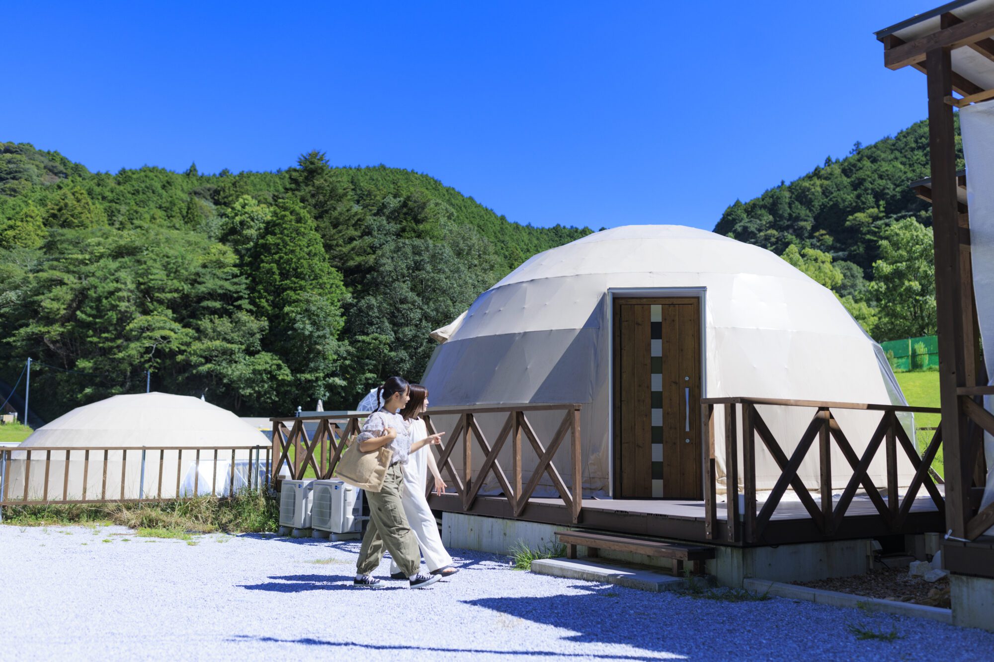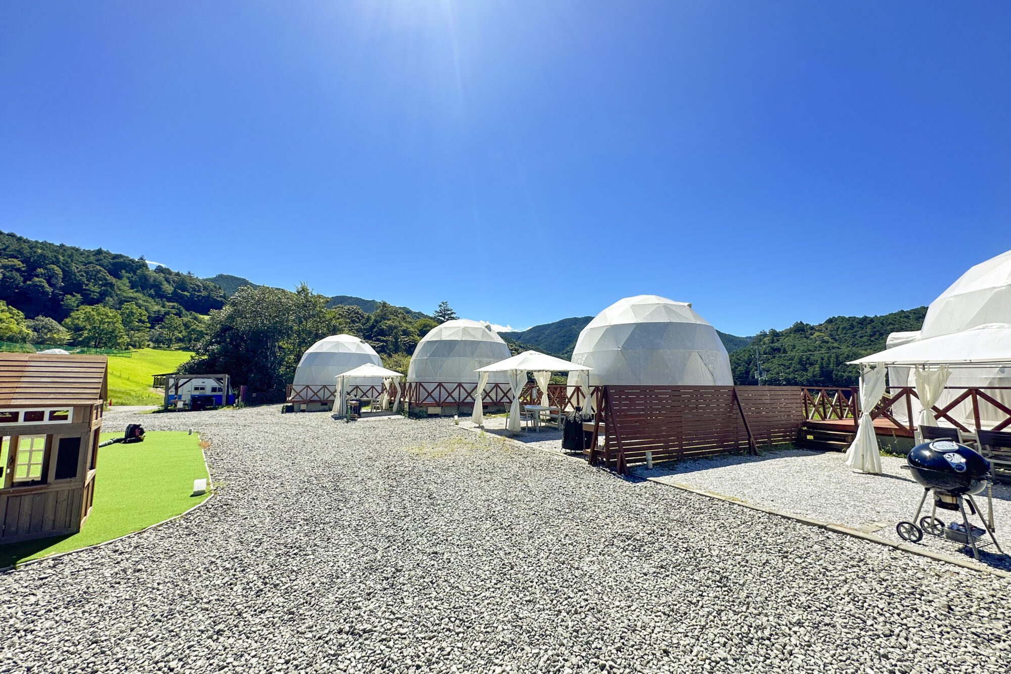 兩人住宿的是“天空山高爾夫俱樂部”附設的“天空山豪華露營~四萬十星空~”。這裡有穹頂帳篷、拖車屋和自動網站三個區域。這次兩人預約的是享受奢侈度假氛圍的圓頂帳篷。