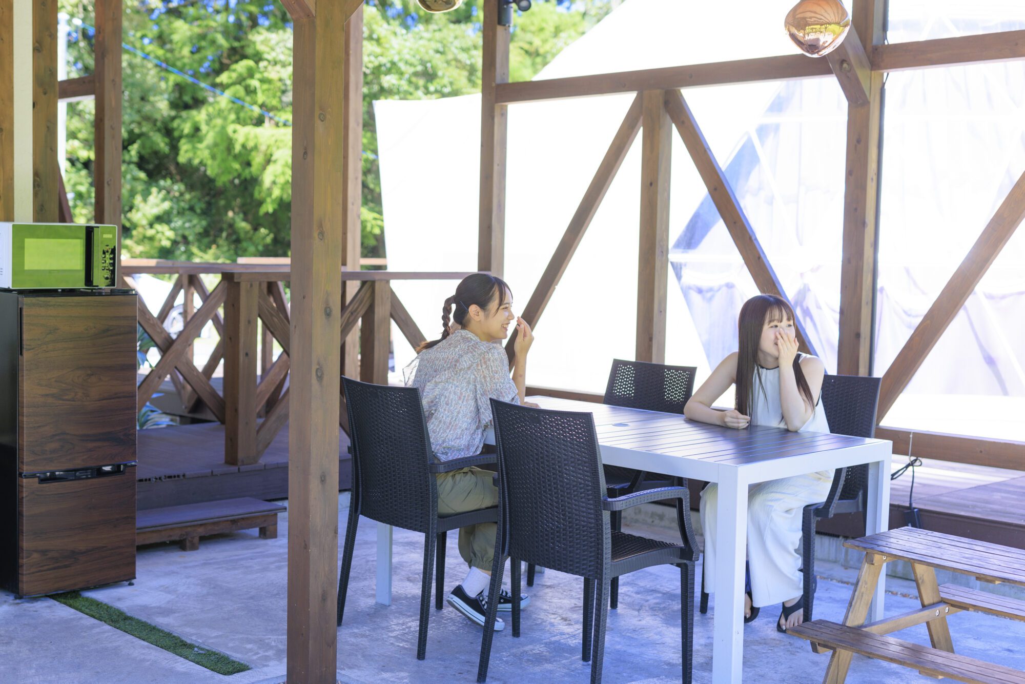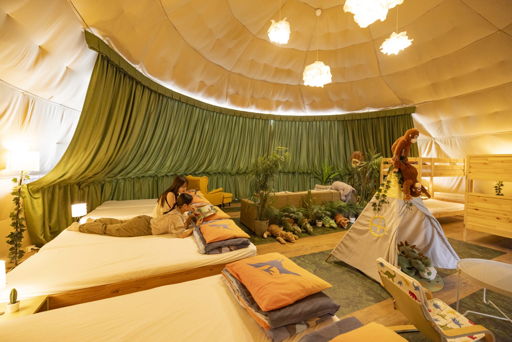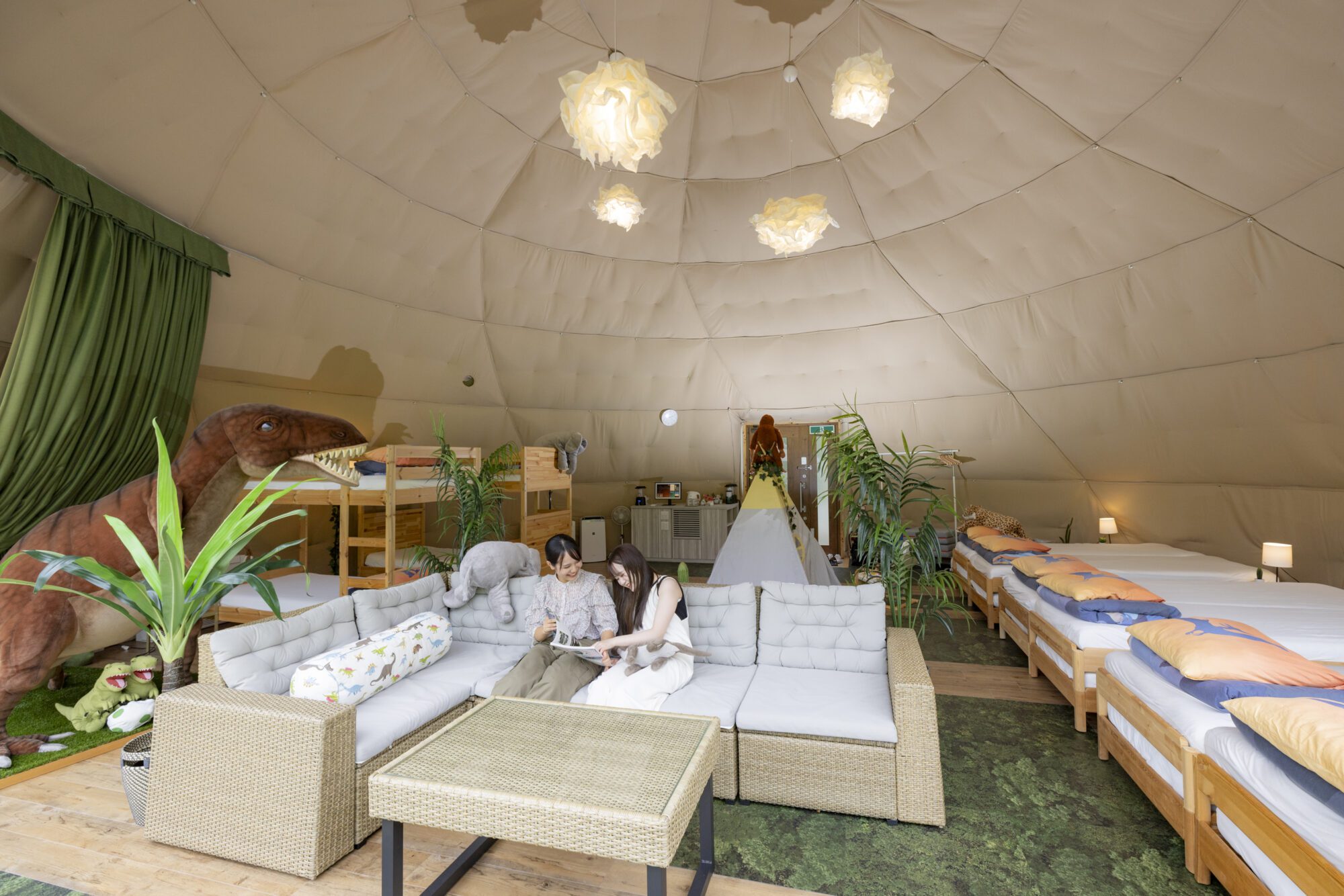 到達帶寬敞露天浴池的10m巨蛋帳篷“Dinosaur”。可愛的室內裝飾讓人情緒高漲的兩人!在充滿度假心情的室內拍紀念照,悠閒地看雜誌,放鬆心情,緩解兜風的疲勞吧。