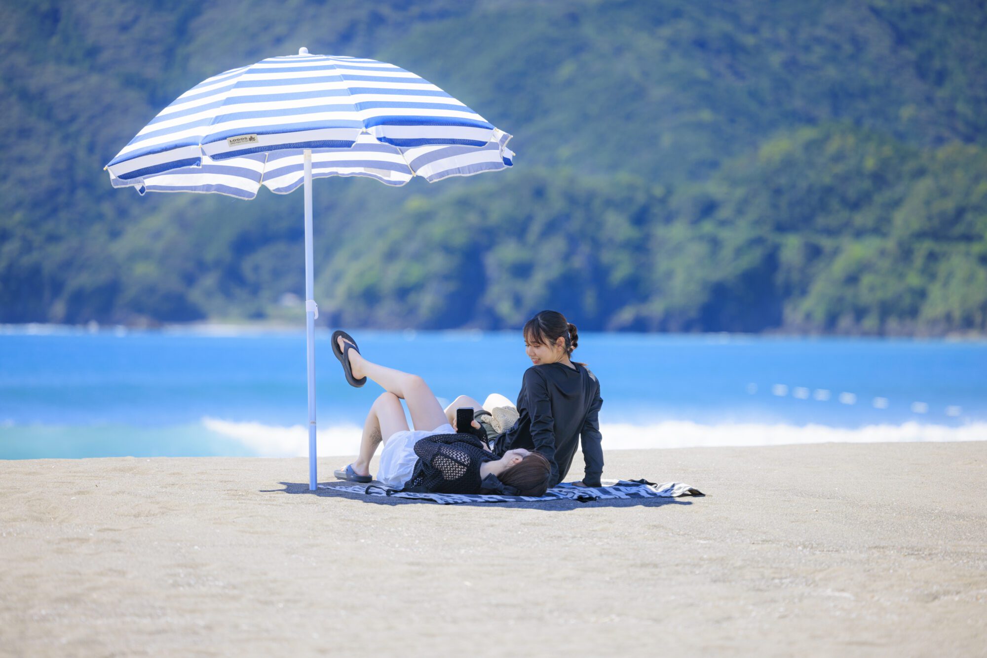張開遮陽傘,一邊眺望大海一邊悠閒地休息。忘了時間,聊天時花開了。正是這個時間,才是令人難以置信的女子之旅所特有的樂趣。