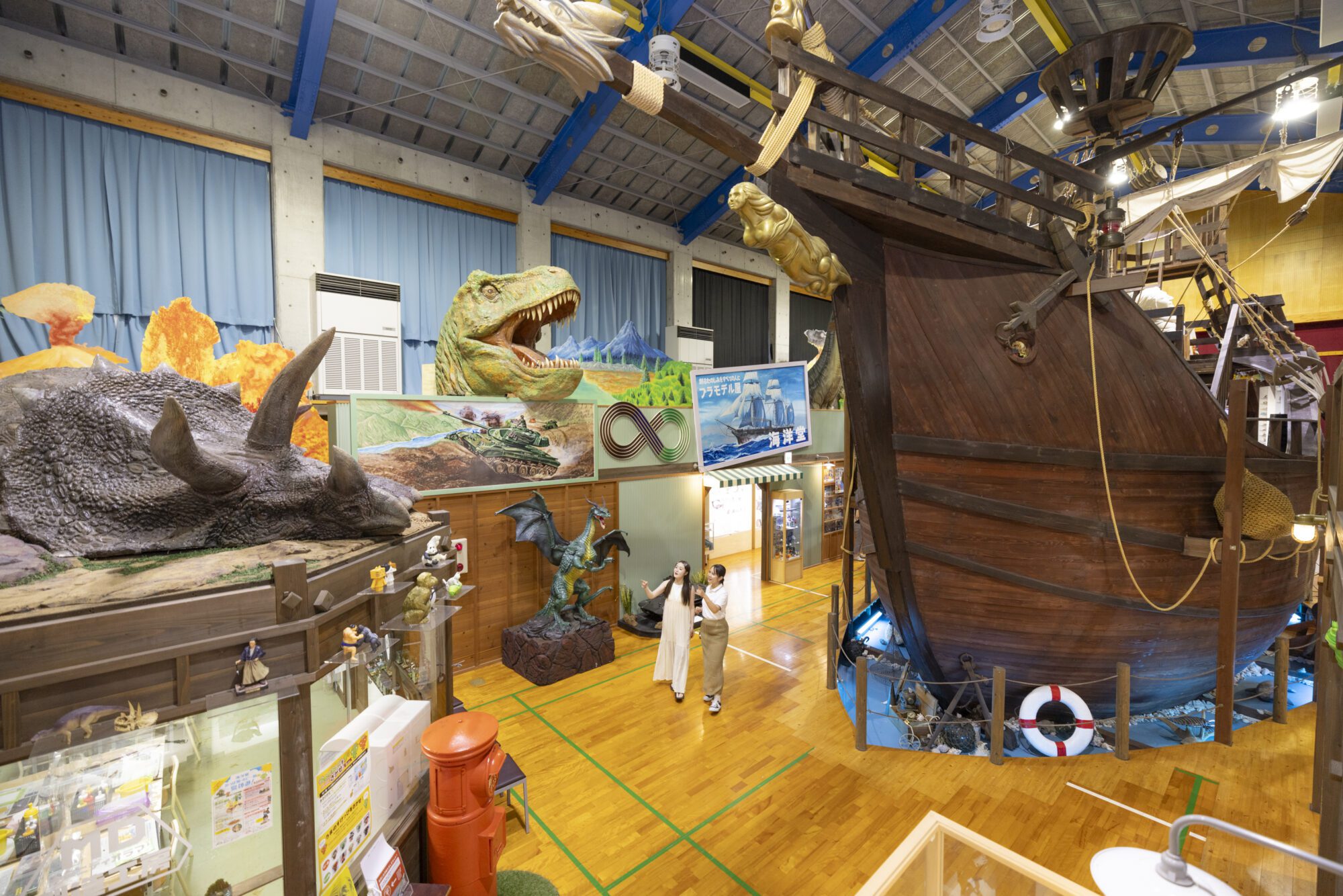 館內保留著體育館的地板、講臺、窗簾等。像這樣珍惜利用有點懷舊的體育館,也只有海洋堂HOBBY館四萬十才有的。拔掉中央地板放置的大型加泰羅尼亞船(這裡也是展示空間!)和,放置在比視線高的地方的大恐龍的手辦等,充滿玩心的演出也是樂趣之一。