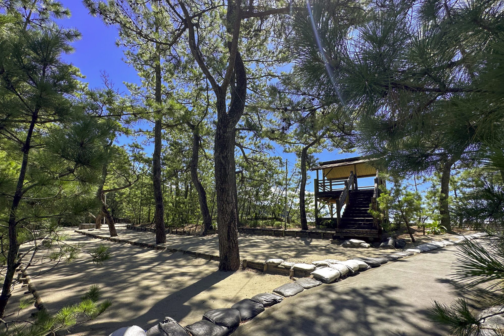 從停車場步行到海水浴場就到。穿過松林,眼前是翡翠綠的大海。