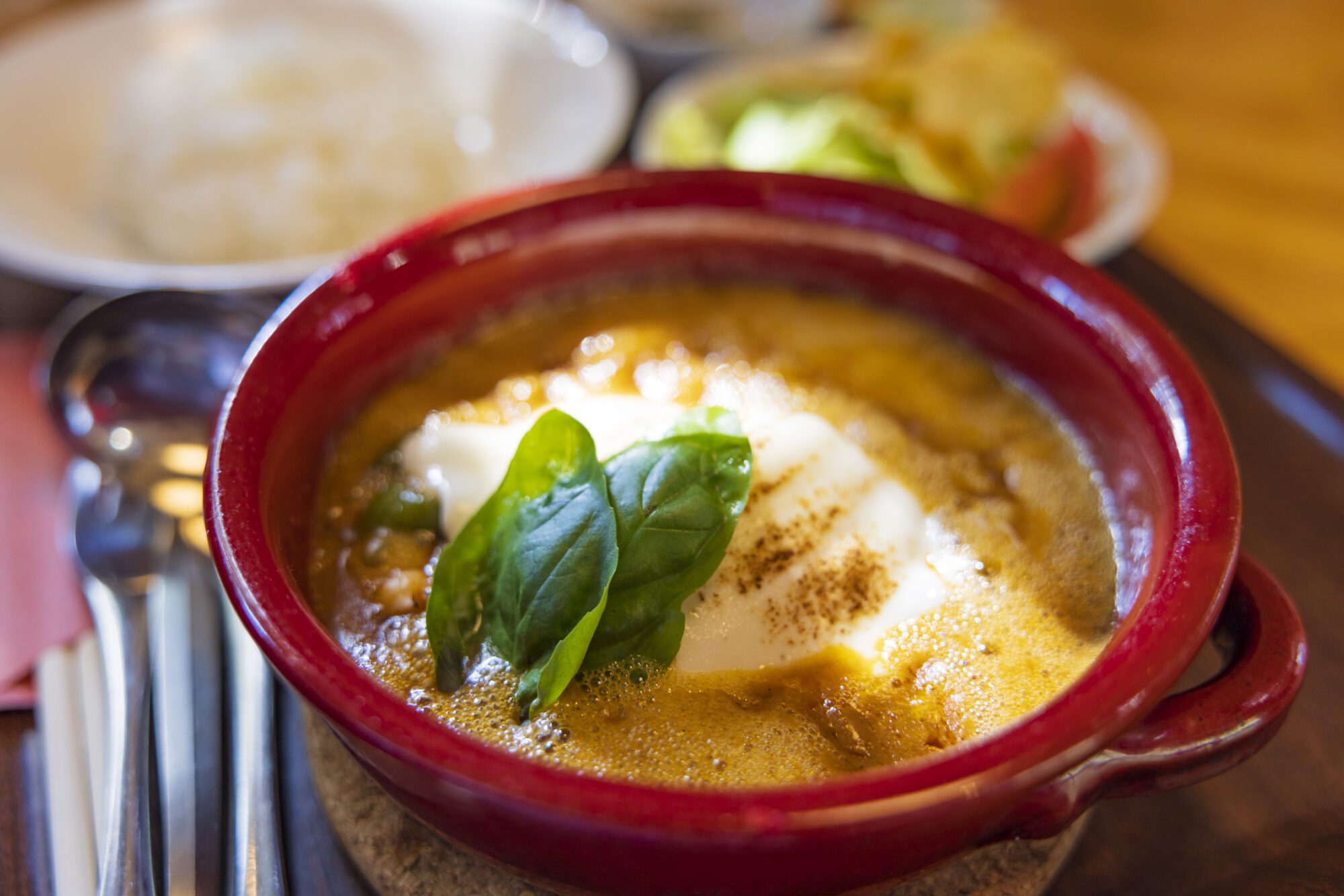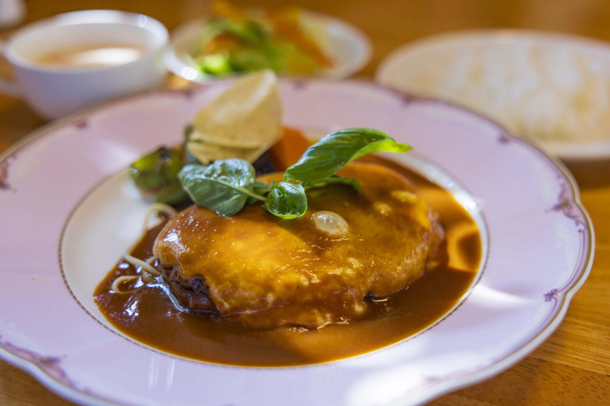 兩人收到的是“馬蘇裡拉起司烤漢堡肉餅”、“馬蘇裡拉起司和砂鍋鑰匙馬風味咖喱”。招牌菜單中的漢堡肉餅使用每天早上採購的四萬十黑毛和牛和四萬十豬肉,醬汁是用四萬十町產的牛筋肉精心煮的demiglass調味汁做成生薑。除此之外,所有的大米都拘泥於四萬十町產的仁井田米,雞蛋也拘泥於四萬十町產的高原雞蛋,在安靜的店內可以享受到優質的味道。