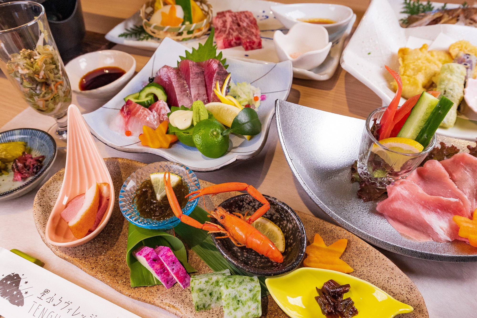 晚餐可以從“天狗之膳”、“清流之膳”、“山村之膳”三種套餐中選擇。無論哪個套餐都很重視當季的食材,從野菜到新鮮度高的生魚片、引以為豪的肉料理,都能品嘗到各種各樣的“高知”。