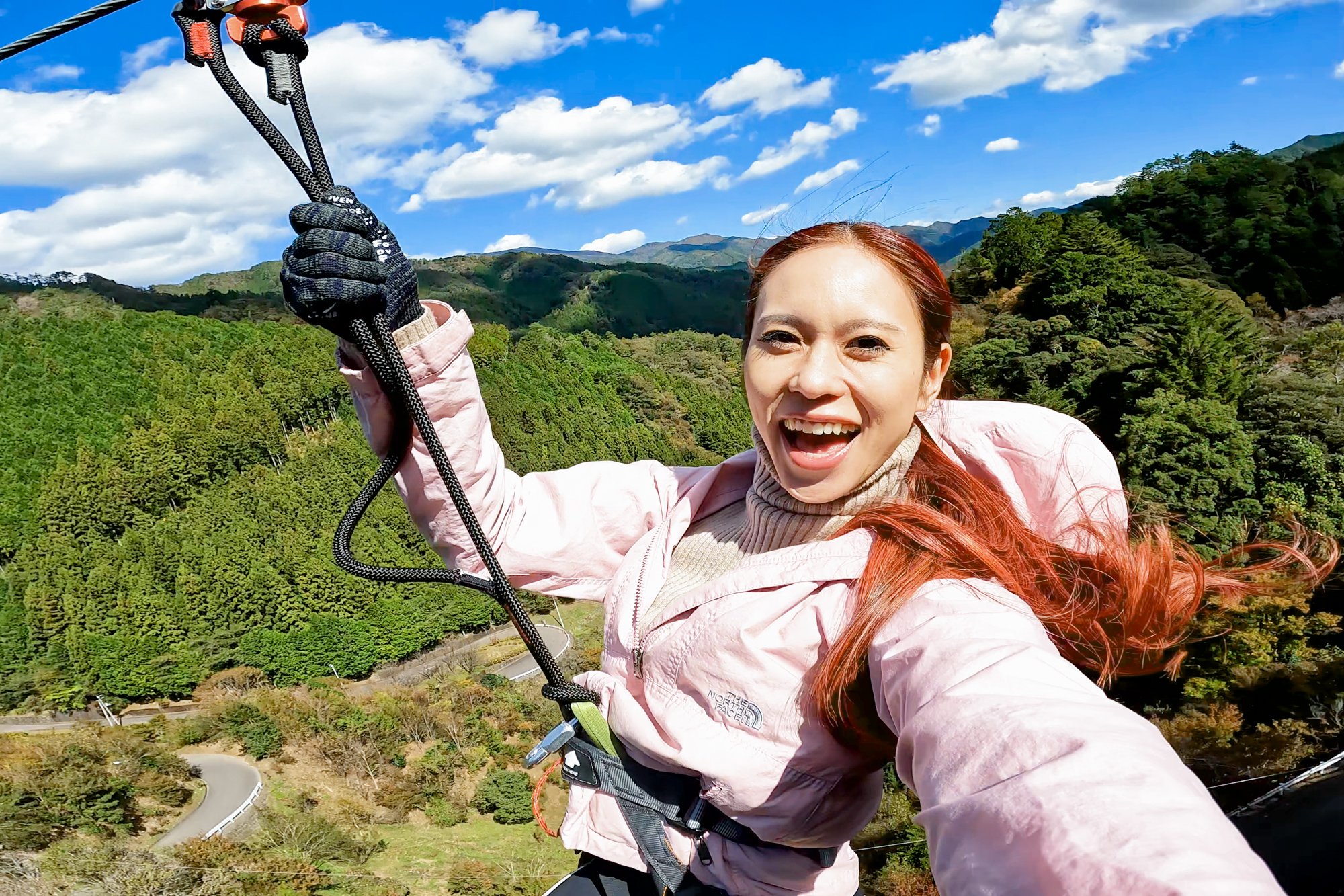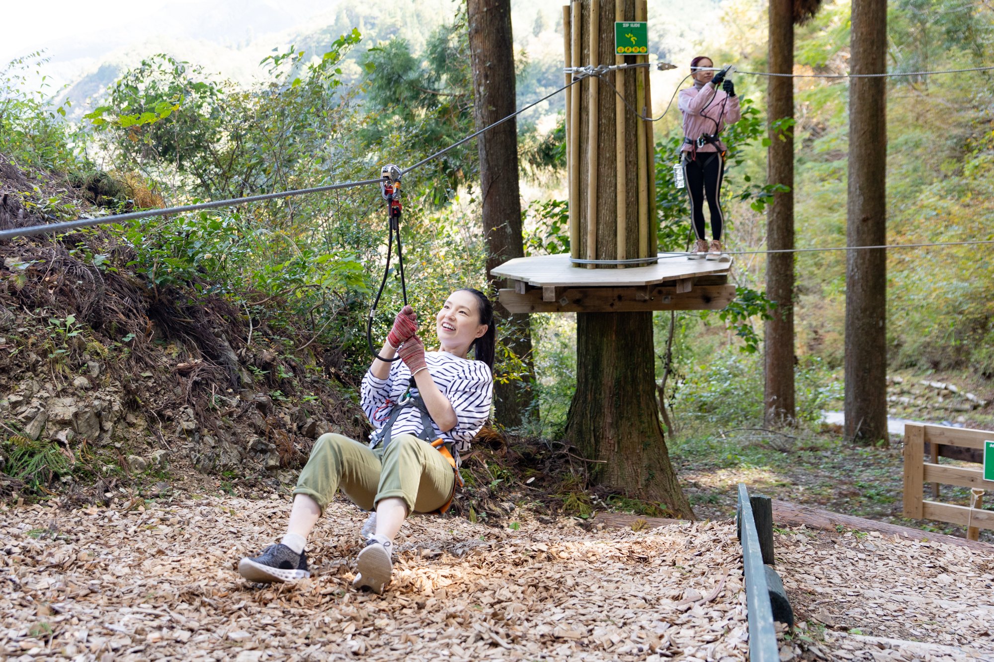 冒險路線的拉鏈線,距離地面最大40米,全長337米,是縣內最大的長度。 一邊眺望津野町的群山,一邊橫穿森林中的拉鏈讓人感到恐怖,張開雙手滑行的話,可以感受到日常生活中無法體會到的浮遊感和刺激。